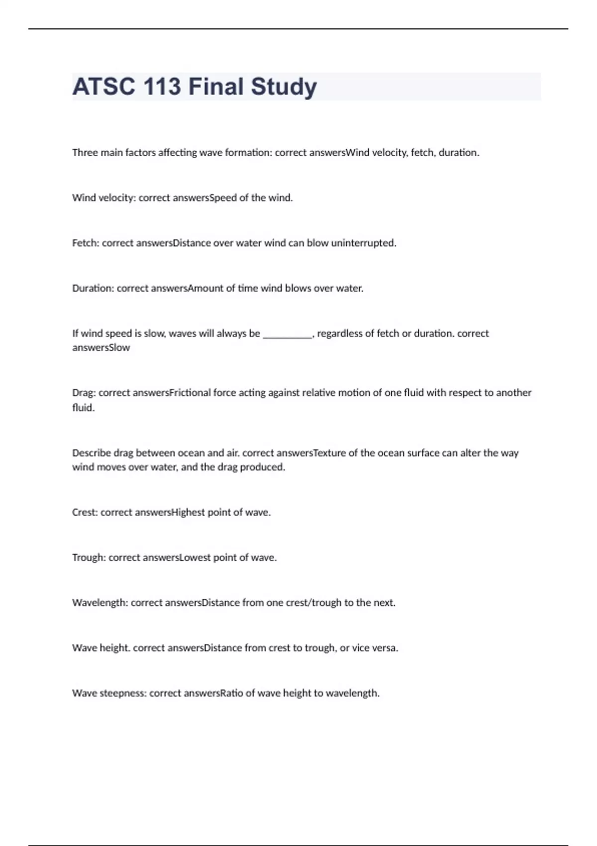 Three main factors affecting wave formation: correct answersWind velocity, fetch, duration. Wind velocity: correct answersSpeed of the wind. Fetch: correct answersDistance over water wind can blow uninterrupted. Duration: correct answersAmount of time wind blows over water. If wind speed is slow, waves will always be _________, regardless of fetch or duration. correct answersSlow Drag: correct answersFrictional force acting against relative motion of one fluid with respect to another fluid.