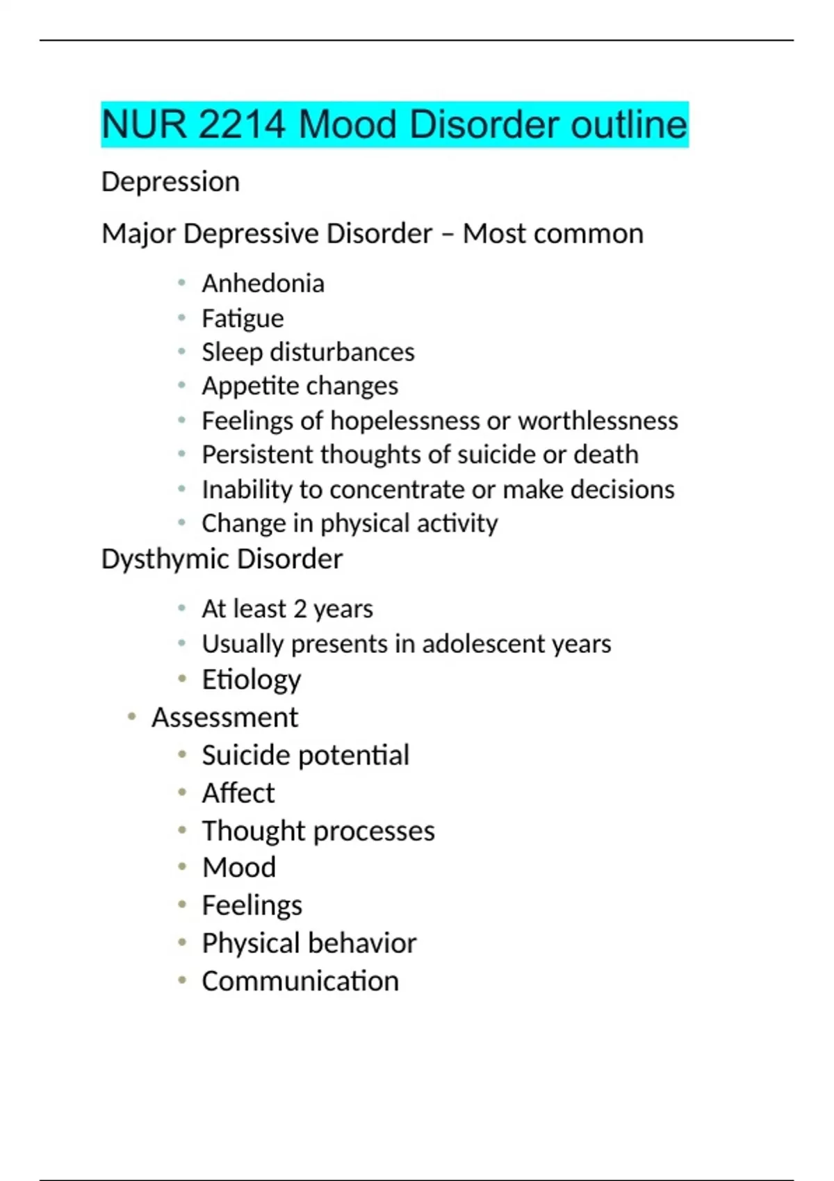 NUR 2214 Mood Disorder outline