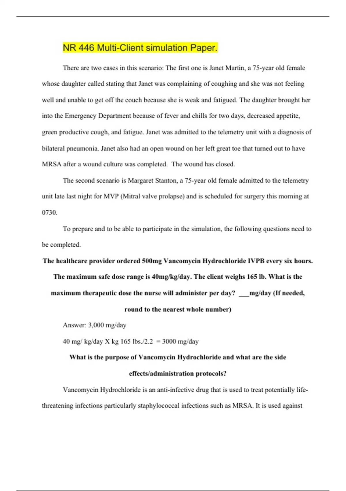 NR 446 Multi-Client simulation Paper.There are two cases in this scenario: The first one is Janet Martin, a 75-year old female whose daughter called stating that Janet was complaining of coughing and she was not feeling well and unable to get off the couch because she is weak and fatigued. The daughter brought her into the Emergency Department because of fever and chills for two days, decreased appetite, green productive cough, and fatigue. Janet was admitted to the telemetry unit with a diagnosis of bilateral pneumonia. Janet also had an open wound on her left great toe that turned out to have MRSA after a wound culture was completed. The wound has closed. The second scenario is Margaret Stanton, a 75-year old female admitted to the telemetry unit late last night for MVP (Mitral valve prolapse) and is scheduled for surgery this morning at 0730.