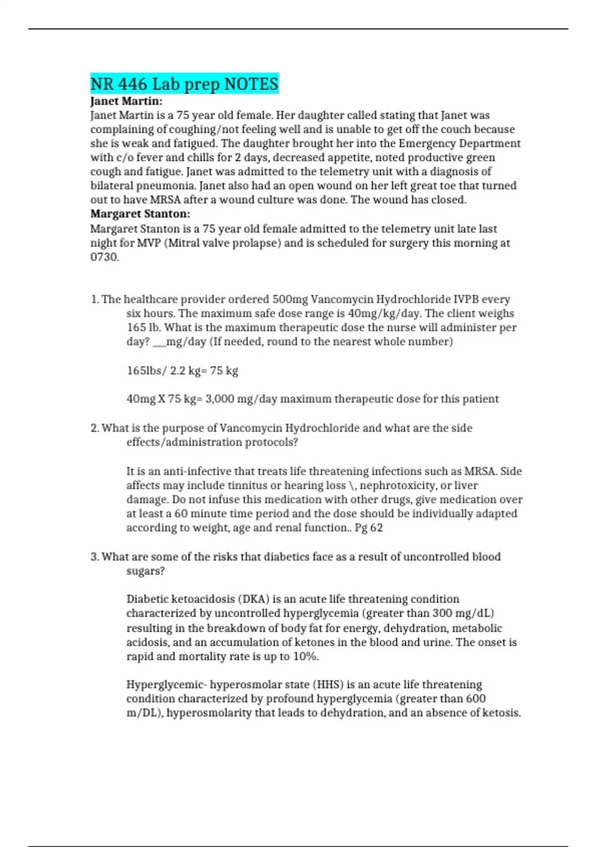 NR 446 Lab prep NOTESJanet Martin is a 75 year old female. Her daughter called stating that Janet was complaining of coughing/not feeling well and is unable to get off the couch because she is weak and fatigued. The daughter brought her into the Emergency Department with c/o fever and chills for 2 days, decreased appetite, noted productive green cough and fatigue. Janet was admitted to the telemetry unit with a diagnosis of bilateral pneumonia. Janet also had an open wound on her left great toe that turned out to have MRSA after a wound culture was done. The wound has closed. Margaret Stanton: Margaret Stanton is a 75 year old female admitted to the telemetry unit late last night for MVP (Mitral valve prolapse) and is scheduled for surgery this morning at 0730. 1. The healthcare provider ordered 500mg Vancomycin Hydrochloride IVPB every six hours. The maximum safe dose range is 40mg/kg/day. The client weighs 165 lb. What is the maximum therapeutic dose the nurse will administer per day? ___mg/day (If needed, round to the nearest whole number)