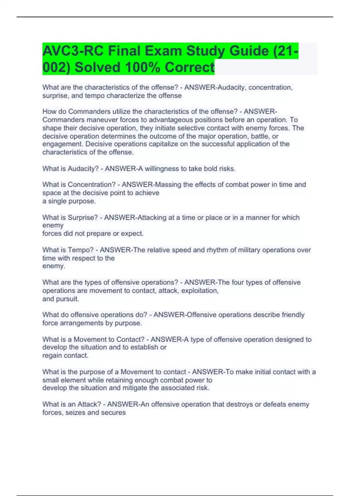 What are the characteristics of the offense? - ANSWER-Audacity, concentration, surprise, and tempo characterize the offense How do Commanders utilize the characteristics of the offense? - ANSWER-Commanders maneuver forces to advantageous positions before an operation. To shape their decisive operation, they initiate selective contact with enemy forces. The decisive operation determines the outcome of the major operation, battle, or engagement. Decisive operations capitalize on the successful application of the characteristics of the offense. What is Audacity? - ANSWER-A willingness to take bold risks. What is Concentration? - ANSWER-Massing the effects of combat power in time and space at the decisive point to achieve a single purpose. What is Surprise? - ANSWER-Attacking at a time or place or in a manner for which enemy forces did not prepare or expect. What is Tempo? - ANSWER-The relative speed and rhythm of military operations over time with respect to the enemy. What are the types of offensive operations? - ANSWER-The four types of offensive operations are movement to contact, attack, exploitation, and pursuit. What do offensive operations do? - ANSWER-Offensive operations describe friendly force arrangements by purpose. What is a Movement to Contact? - ANSWER-A type of offensive operation designed to develop the situation and to establish or regain contact. What is the purpose of a Movement to contact - ANSWER-To make initial contact with a small element while retaining enough combat power to develop the situation and mitigate the associated risk. What is an Attack? - ANSWER-An offensive operation that destroys or defeats enemy forces, seizes and secures terrain, or both. What is the purpose of an attack? - ANSWER-incorporate coordinated movement supported by fires. What is an Exploitation - ANSWER-A type of offensive operation that usually follows a successful attack and is designed to disorganize the enemy in depth. What is the purpose of an Exploitation? - ANSWER-Exploitations seek to disintegrate enemy forces to the point where they have no alternative but to surrender or retreat. What is the definition and purpose of Pursuit? - ANSWER-A type of offensive operation designed to catch or cut off a hostile force attempting to escape, with the aim of destroying it. What are engagement areas? - ANSWER-An area in which the commander intends to trap and destroy an enemy force with the massed fires of all available weapons and supporting systems. How do Commanders integrate Attack Aviation in support of ground operations? - ANSWER-Attack aviation units synchronize their operations in support of the main body's operation through effective development of engagement areas. What is attack by fire position? - ANSWER-An offensive control measure that designates the general position from which a unit conducts the tactical task of attack by fire and non-restrictive. What is the purpose of an attack by fire position? - ANSWER-The purpose of these positions is to mass the effects of direct fire systems for one or multiple locations toward the enemy. What is a support by fire position? - ANSWER-An offensive control measure that designates the general position from which a unit conducts the tactical mission task of support by fire. What is the purpose of a support by fire position? - ANSWER-To increase the supported force's freedom of maneuver by placing direct fires on an objective that is going to be assaulted by a friendly force. What is a battle position? - ANSWER-A defensive intent graphic that depicts an area for attack helicopters to maneuver and fire into a designated EA and is restrictive.