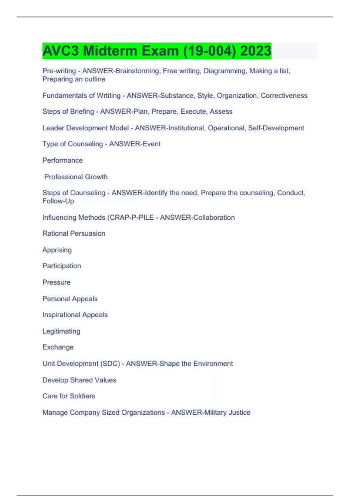 Pre-writing - ANSWER-Brainstorming, Free writing, Diagramming, Making a list, Preparing an outline Fundamentals of Wrtiting - ANSWER-Substance, Style, Organization, Correctiveness Steps of Briefing - ANSWER-Plan, Prepare, Execute, Assess Leader Development Model - ANSWER-Institutional, Operational, Self-Development Type of Counseling - ANSWER-Event Performance Professional Growth Steps of Counseling - ANSWER-Identify the need, Prepare the counseling, Conduct, Follow-Up Influencing Methods (CRAP-P-PILE - ANSWER-Collaboration Rational Persuasion Apprising Participation Pressure Personal Appeals Inspirational Appeals Legitimating Exchange Unit Development (SDC) - ANSWER-Shape the Environment Develop Shared Values Care for Soldiers Manage Company Sized Organizations - ANSWER-Military Justice Property Management Maintenance Operations SFRG Principle of Mission Command - ANSWER-Mutual Trust Shared Understanding Commander's Intent Disciplined Initiative Mission Orders Accept Risk Competence (new) ULO - ANSWER-how the Army seizes, retains, and exploits the initiative to gain and maintain a position of relative advantage in sustained land operations through simultaneous offensive, defensive, and stability operations in order to prevent or deter conflict, prevail in war, and create the conditions for favorable conflict resolution MC Philosphy - ANSWER-the exercise of authority and direction by the commander using mission orders to enable disciplined initiative within the commander's intent to empower agile and adaptive leaders in the conduct of unified land operations MC Warfighting Function (Fake news) - ANSWER-related tasks and systems that develop and integrate those activities enabling a commander to balance the art of command and the science of control in order to integrate the other warfighting functions. MC System - ANSWER-arrangement of personnel, networks, information systems, processes, procedures, facilities and equipment that enable commanders to conduct operations. Art of Command - ANSWER-The creative and skillful exercise of authority through timely decision-making and leadership (ADP 6-0). As an art, command requires the use of judgment Science of Control - ANSWER-Systems and procedures used to improve the commander's understanding and support accomplishing missions (ADP 6-0). The science of control supports the art of command.