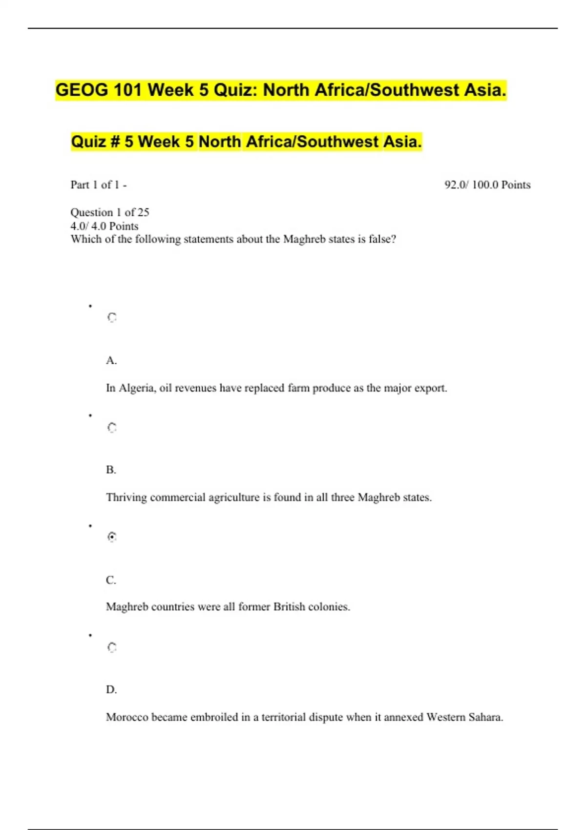 GEOG 101 Week 5 Quiz North AfricaSouthwest Asia questions and answers} (2022/2023) (verified answers)