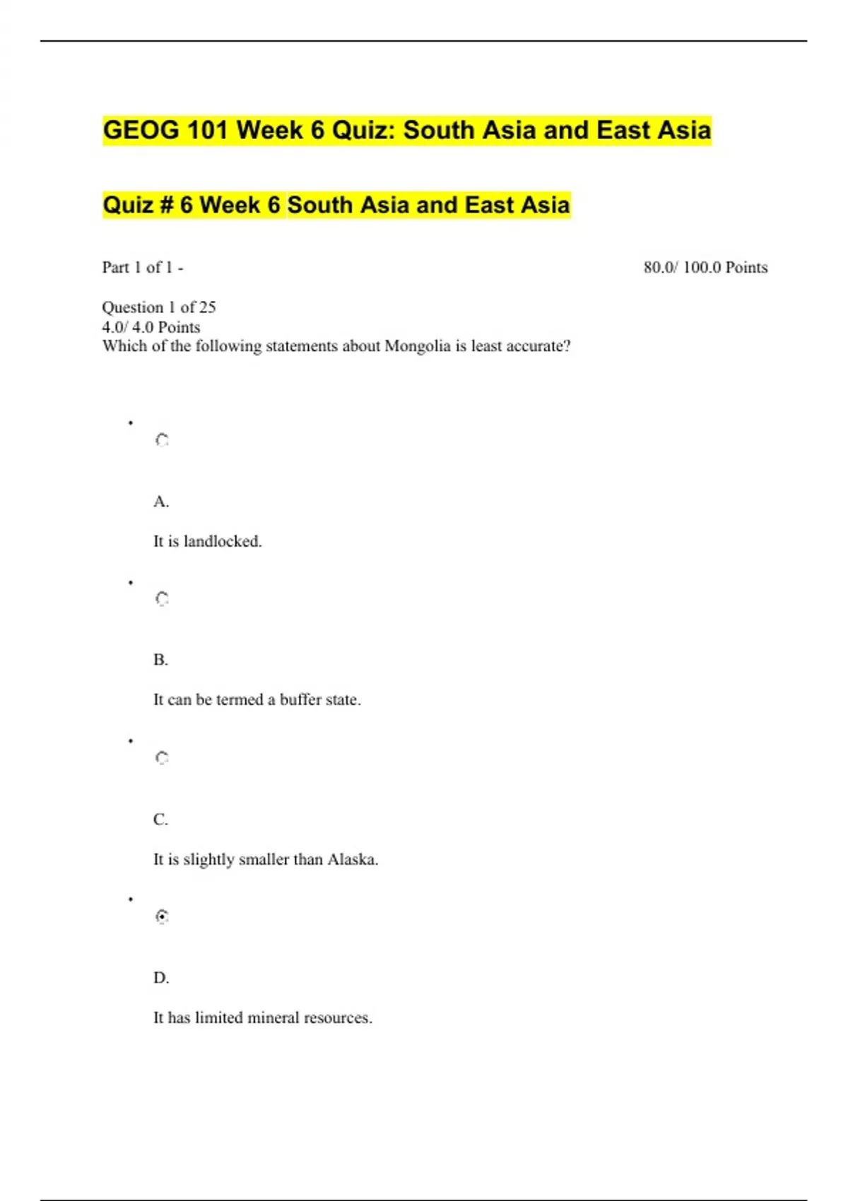 GEOG 101 Week 6 Quiz South Asia and East Asia questions and answers} (2022/2023) (verified answers)
