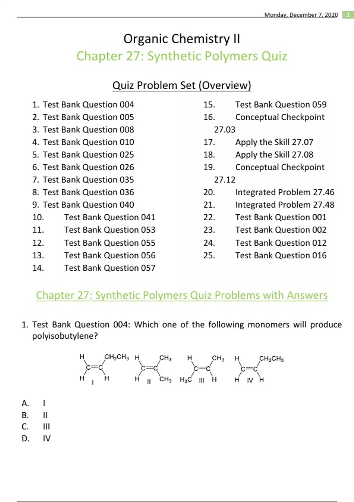 Organic Chemistry II official quiz given in the Fall 2020 semester over Chapter 27: Synthetic Polymers. Provided are both the question and the correct solutions.