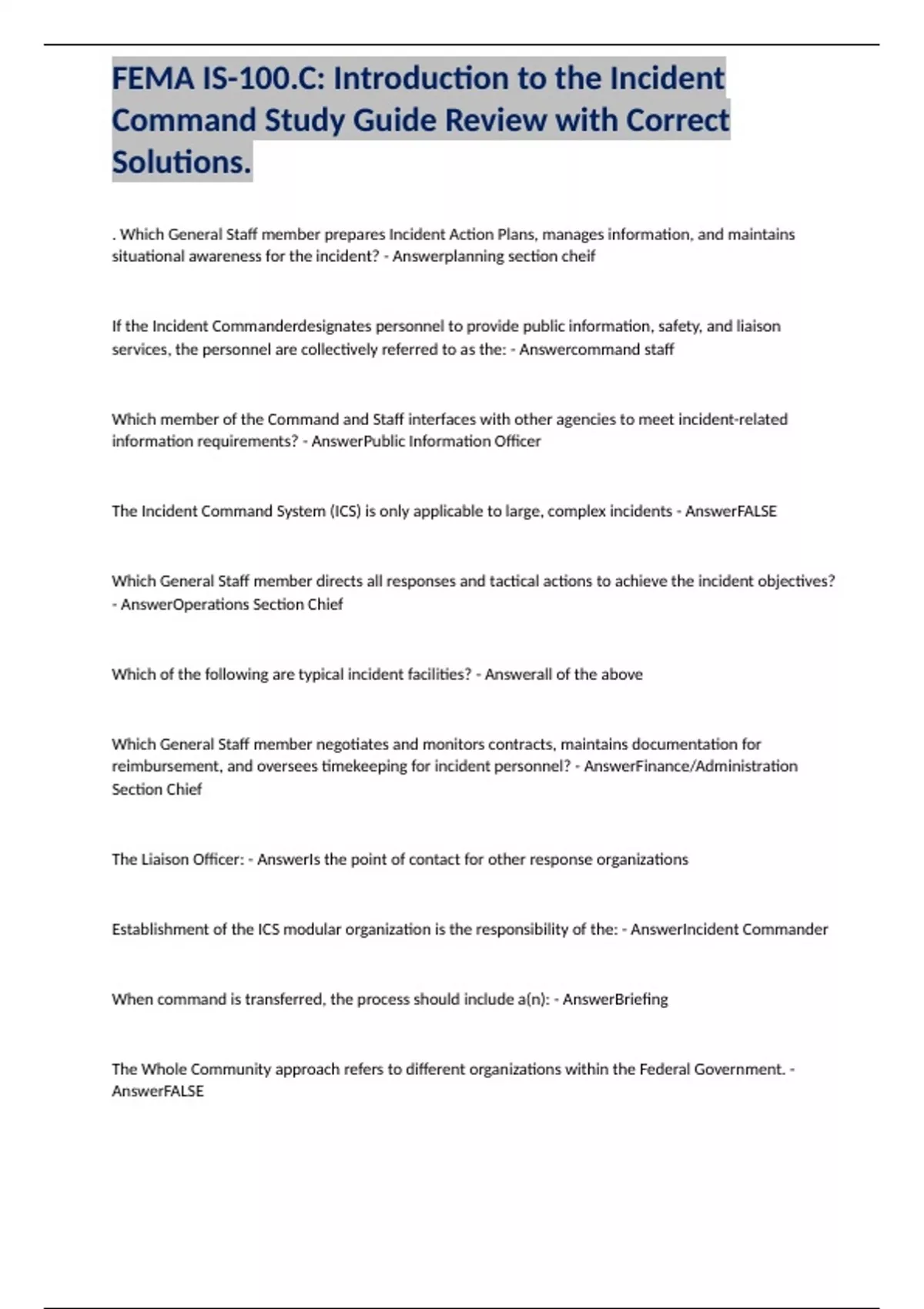 FEMA IS-100.C: Introduction to the Incident Command Study Guide Review with Correct Solutions.