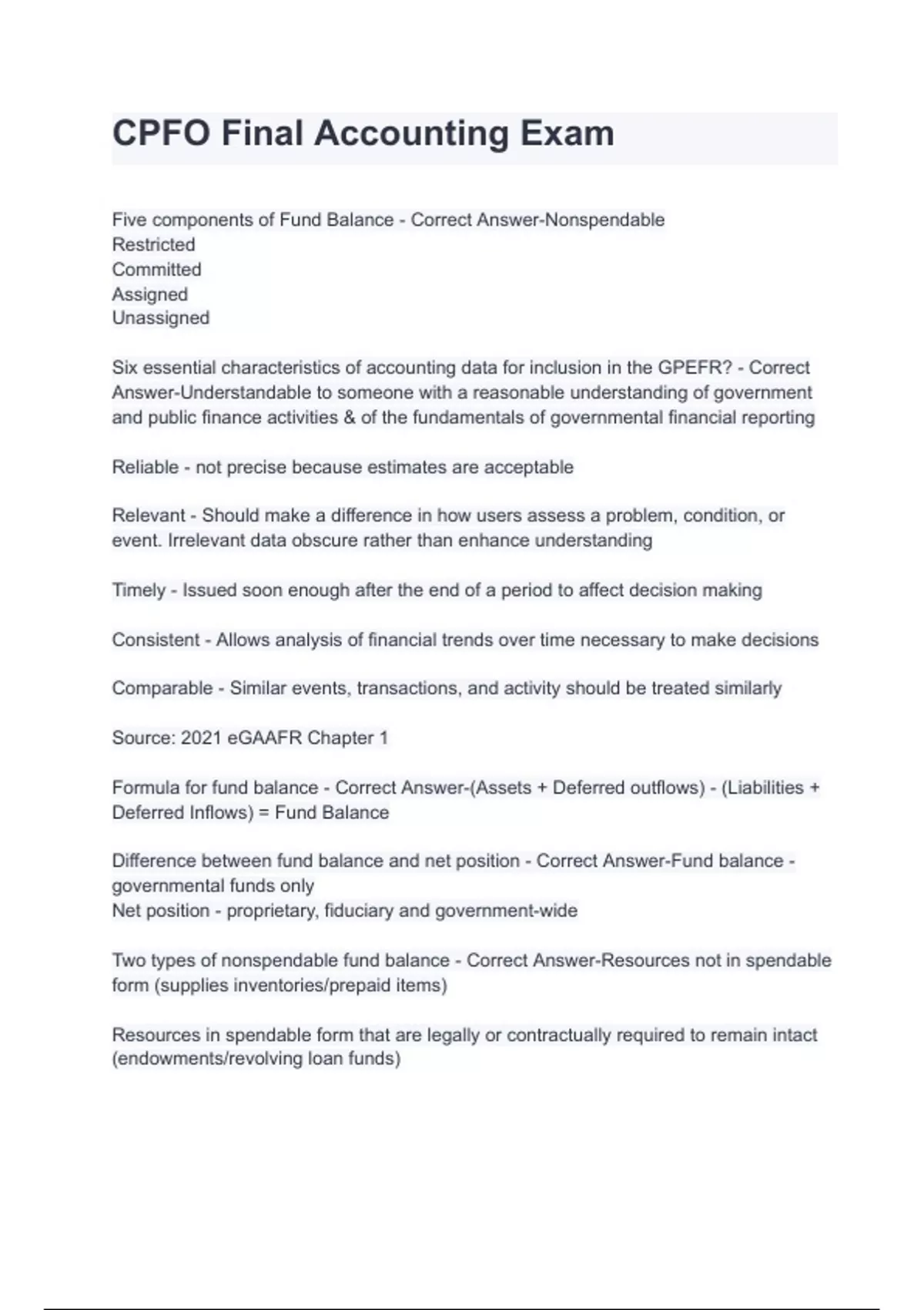 CPFO Final Accounting Exam Five components of Fund Balance - Correct Answer-Nonspendable Restricted Committed Assigned Unassigned Six essential characteristics of accounting data for inclusion in the GPEFR? - Correct Answer-Understandable to someone with a reasonable understanding of government and public finance activities & of the fundamentals of governmental financial reporting Reliable - not precise because estimates are acceptable Relevant - Should make a difference in how users assess a problem, condition, or event. Irrelevant data obscure rather than enhance understanding Timely - Issued soon enough after the end of a period to affect decision making Consistent - Allows analysis of financial trends over time necessary to make decisions Comparable - Similar events, transactions, and activity should be treated similarly Source: 2021 eGAAFR Chapter 1 Formula for fund balance - Correct Answer-(Assets + Deferred outflows) - (Liabilities + Deferred Inflows) = Fund Balance Difference between fund balance and net position - Correct Answer-Fund balance - governmental funds only Net position - proprietary, fiduciary and government-wide Two types of nonspendable fund balance - Correct Answer-Resources not in spendable form (supplies inventories/prepaid items) Resources in spendable form that are legally or contractually required to remain intact (endowments/revolving loan funds) Difference between restricted and committed fund balance - Correct Answer-Restricted - externally enforceable restraints Committed - internally, self-imposed legal restrictions set by the government's highest level of authority (Council) Which funds can have a positive unassigned fund balance? - Correct Answer-Only the general fund. All other funds have a specific purpose, so they would always be restricted, committed or assigned How are encumbrances classified in fund balance? - Correct Answer-All encumbrances must be classified as restricted, committed, or assigned, based on the type of funds used to encumber. Encumbrances not made from restricted or committed must be assigned. Note: Encumbrances are not reported separately within restricted, committed, assigned, on the face of the financials Three differences between committed and assigned fund balance - Correct Answer-Committed Who? Highest level of authority (Council) How? Formal action by Council When? No later than the end of reporting period. Assigned Who? Lower level, can be delegated by Council How? Less formal action When? can occur at a later date (decision based on final figures for the reporting period. How are stabilization funds recorded in fund balance? - Correct Answer-Restricted or Committed - never assigned - expressly prohibited by accounting guidance What is the maximum amount of fund balance that can be assigned? - Correct Answer-The difference between total fund balance and the sum of its nonspendable, restricted and committed components. Assignments cannot result in a negative fund balance Can funds have a negative unassigned fund balance? - Correct Answer-Governmental funds, other than the general fund, show a negative unassigned fund balance when nonspendable, restricted and committed exceed total fund balance.