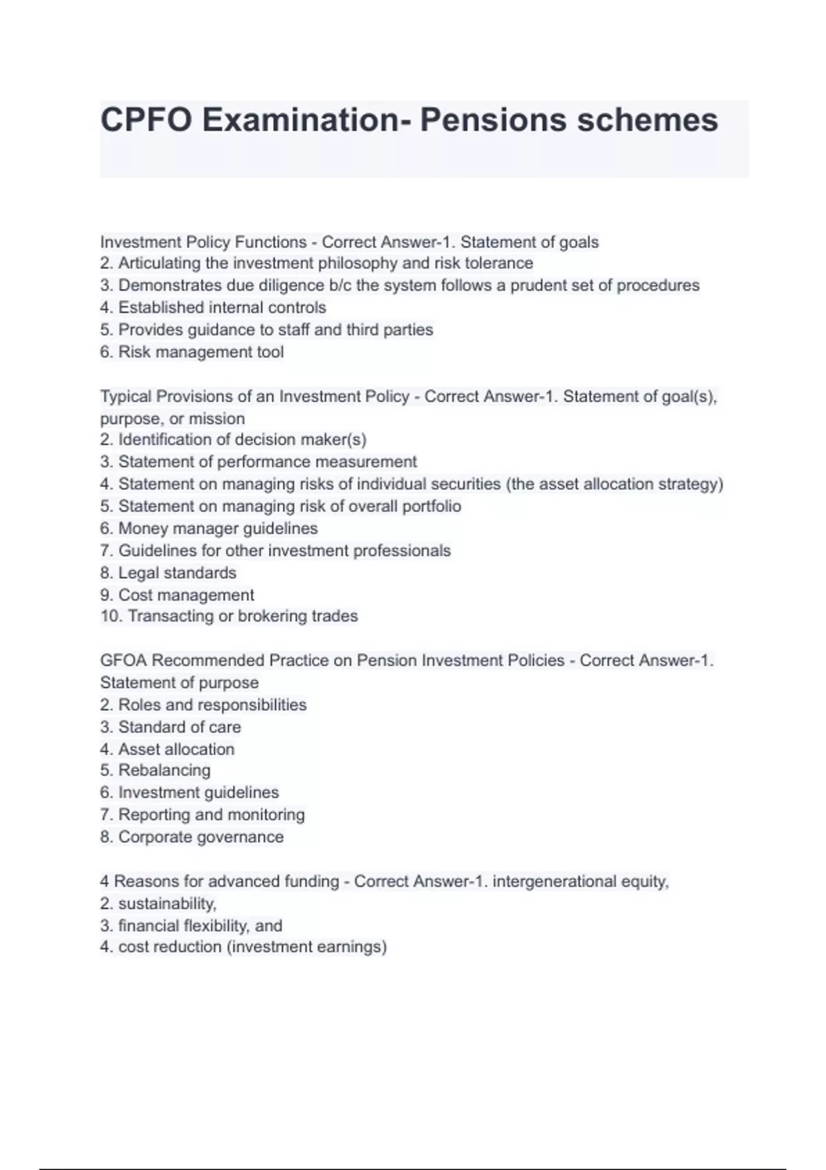 CPFO Examination- Pensions schemes Investment Policy Functions - Correct Answer-1. Statement of goals 2. Articulating the investment philosophy and risk tolerance 3. Demonstrates due diligence b/c the system follows a prudent set of procedures 4. Established internal controls 5. Provides guidance to staff and third parties 6. Risk management tool Typical Provisions of an Investment Policy - Correct Answer-1. Statement of goal(s), purpose, or mission 2. Identification of decision maker(s) 3. Statement of performance measurement 4. Statement on managing risks of individual securities (the asset allocation strategy) 5. Statement on managing risk of overall portfolio 6. Money manager guidelines 7. Guidelines for other investment professionals 8. Legal standards 9. Cost management 10. Transacting or brokering trades GFOA Recommended Practice on Pension Investment Policies - Correct Answer-1. Statement of purpose 2. Roles and responsibilities 3. Standard of care 4. Asset allocation 5. Rebalancing 6. Investment guidelines 7. Reporting and monitoring 8. Corporate governance 4 Reasons for advanced funding - Correct Answer-1. intergenerational equity, 2. sustainability, 3. financial flexibility, and 4. cost reduction (investment earnings)