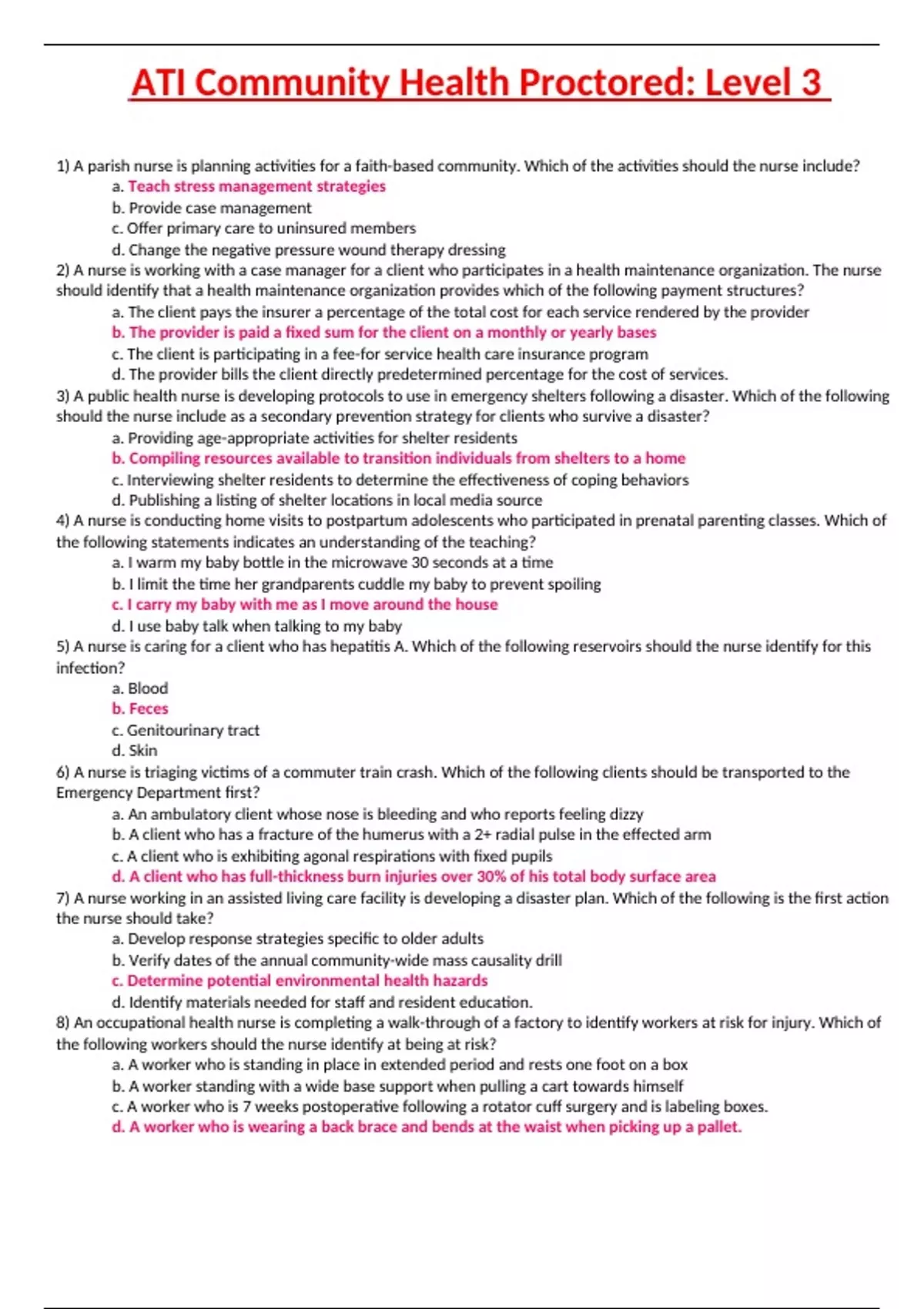 ATI Community Health Proctored: Level 3 ) A nurse is caring for a client who has hepatitis A. Which of the following reservoirs should the nurse identify for this infection? a. Blood b. Feces c. Genitourinary tract d. Skin 6) A nurse is triaging victims of a commuter train crash. Which of the following clients should be transported to the Emergency Department first? a. An ambulatory client whose nose is bleeding and who reports feeling dizzy b. A client who has a fracture of the humerus with a 2+ radial pulse in the effected arm c. A client who is exhibiting agonal respirations with fixed pupils d. A client who has full-thickness burn injuries over 30% of his total body surface area 7) A nurse working in an assisted living care facility is developing a disaster plan. Which of the following is the first action the nurse should take? a. Develop response strategies specific to older adults b. Verify dates of the annual community-wide mass causality drill c. Determine potential environmental health hazards d. Identify materials needed for staff and resident education. 8) An occupational health nurse is completing a walk-through of a factory to identify workers at risk for injury. Which of the following workers should the nurse identify at being at risk? a. A worker who is standing in place in extended period and rests one foot on a box b. A worker standing with a wide base support when pulling a cart towards himself c. A worker who is 7 weeks postoperative following a rotator cuff surgery and is labeling boxes. d. A worker who is wearing a back brace and bends at the waist when picking up a pallet. 9) A nurse is providing teaching to a newly licensed nurse about secondary prevention strategies related to violence and abuse. Which of the following strategies should the nurse include in the teaching? a. Teach a parenting skills class at a child development t center b. Assess client for withdrawal and passivity during home health visits c. Refer clients to the appropriate community agency if signs of abuse is evident d. Coordinate a personal defense program at a local agency 10) A community health nurse is working with a migrant population. The nurse should recognize which of the following interventions is necessary to provide care to this population? a. Requiring the clients to show a work visa before they receive care b. Treating clients on a fee-for-service basis c. Providing health services at work sites d. Offer health screenings at a community center