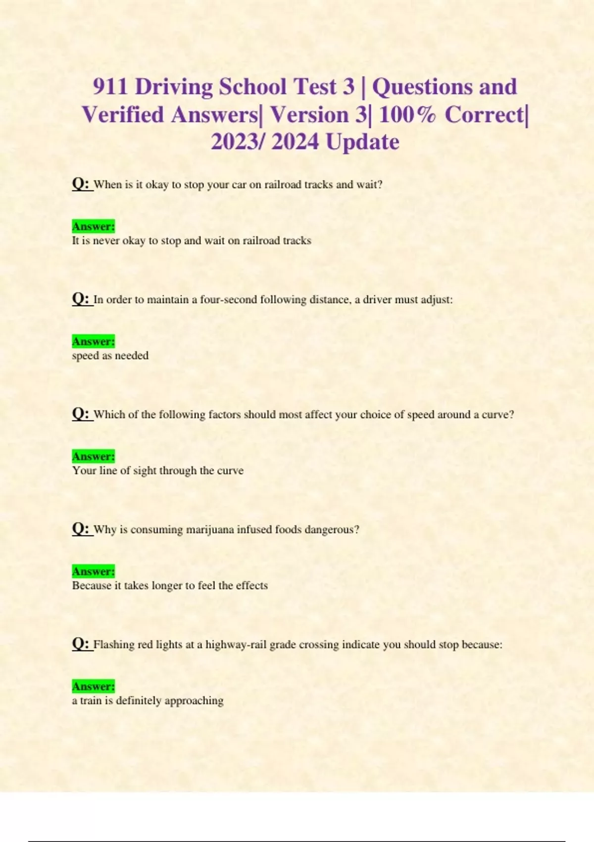 911 Driving School Test 3 | Questions and Verified Answers| Version 3| 100% Correct| 2023/ 2024 Update Q: When is it okay to stop your car on railroad tracks and wait? Answer: It is never okay to stop and wait on railroad tracks Q: In order to maintain a four-second following distance, a driver must adjust: Answer: speed as needed Q: Which of the following factors should most affect your choice of speed around a curve? Answer: Your line of sight through the curve Q: Why is consuming marijuana infused foods dangerous? Answer: Because it takes longer to feel the effects Q: Flashing red lights at a highway-rail grade crossing indicate you should stop because: Answer: a train is definitely approaching Q: Why is it good to shift to a lower gear on a very steep downgrade? Answer: To use the breaking effect of the engine Q: What should you do if you have a flat tire in a tunnel or on a bridge? Answer: Drive out of the tunnel or off the bridge before changing the tire Q: Why should you always read the medicine label? Answer: For the side effects information Q: Why should you prepare to stop if a car is stopped in the right lane of a four-lane street or an intersection that does not have a traffic light? Answer: The car may be waiting for a hidden pedestrian Q: When can a turn be made from other than the far left or far right legal lane? Answer: When traffic signs and pavement markings indicate it