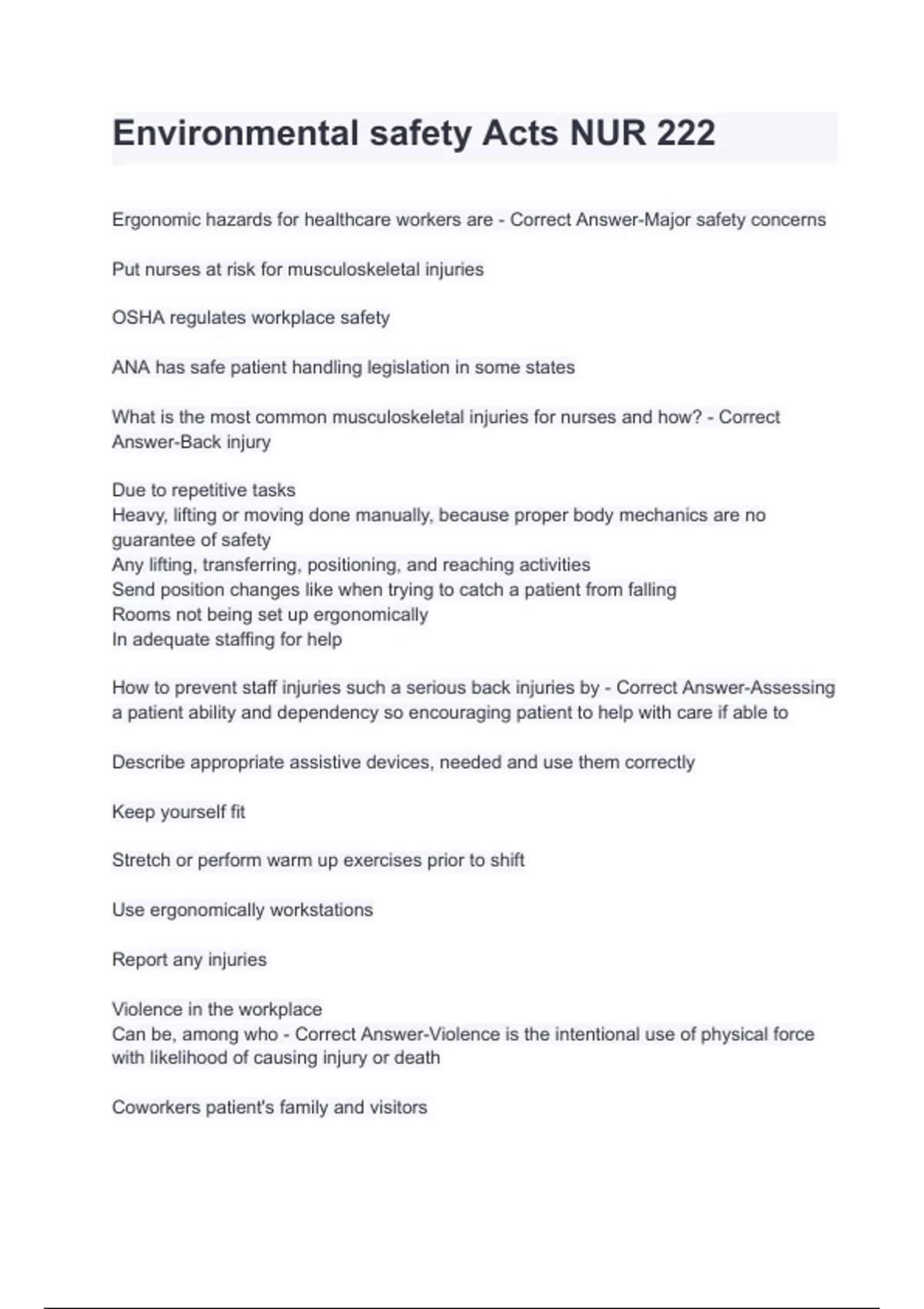 Ergonomic hazards for healthcare workers are - Correct Answer-Major safety concerns Put nurses at risk for musculoskeletal injuries OSHA regulates workplace safety ANA has safe patient handling legislation in some states What is the most common musculoskeletal injuries for nurses and how? - Correct Answer-Back injury Due to repetitive tasks Heavy, lifting or moving done manually, because proper body mechanics are no guarantee of safety Any lifting, transferring, positioning, and reaching activities Send position changes like when trying to catch a patient from falling Rooms not being set up ergonomically In adequate staffing for help