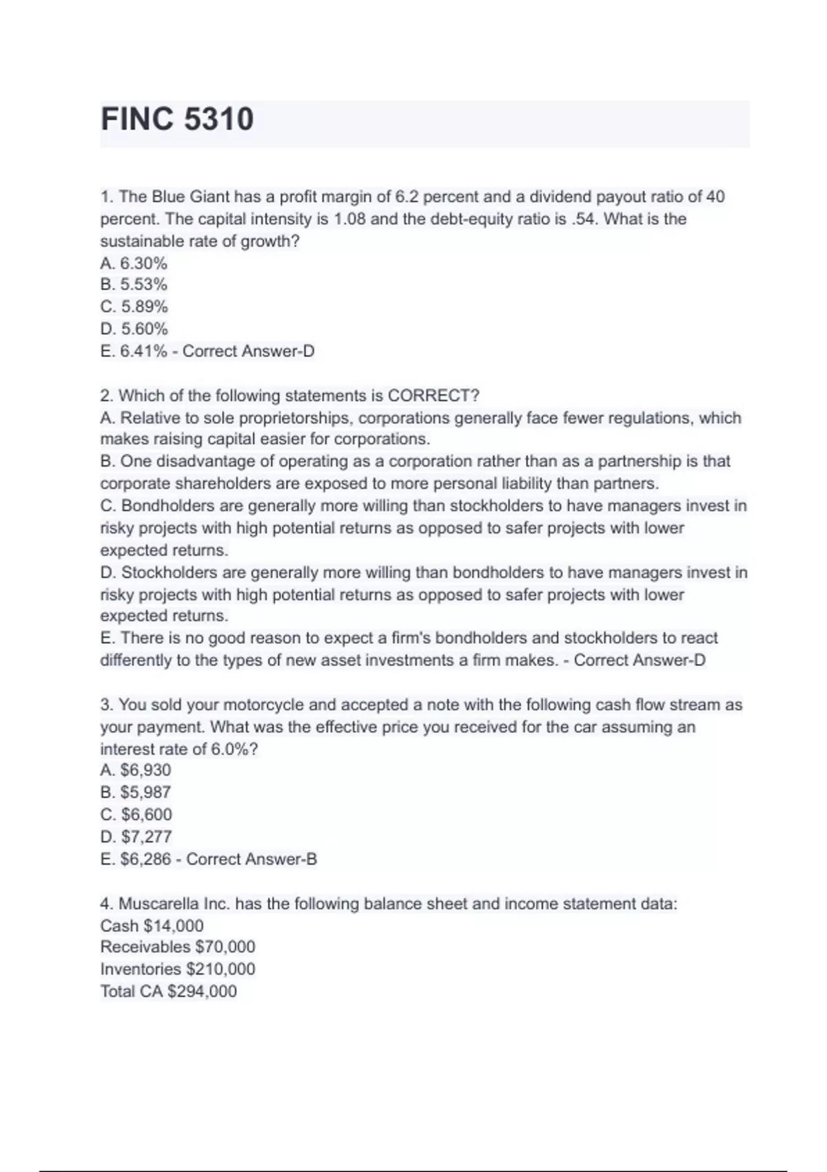 FINC 5310 1. The Blue Giant has a profit margin of 6.2 percent and a dividend payout ratio of 40 percent. The capital intensity is 1.08 and the debt-equity ratio is .54. What is the sustainable rate of growth? A. 6.30% B. 5.53% C. 5.89% D. 5.60% E. 6.41% - Correct Answer-D 2. Which of the following statements is CORRECT? A. Relative to sole proprietorships, corporations generally face fewer regulations, which makes raising capital easier for corporations. B. One disadvantage of operating as a corporation rather than as a partnership is that corporate shareholders are exposed to more personal liability than partners. C. Bondholders are generally more willing than stockholders to have managers invest in risky projects with high potential returns as opposed to safer projects with lower expected returns. D. Stockholders are generally more willing than bondholders to have managers invest in risky projects with high potential returns as opposed to safer projects with lower expected returns. E. There is no good reason to expect a firm's bondholders and stockholders to react differently to the types of new asset investments a firm makes. - Correct Answer-D 3. You sold your motorcycle and accepted a note with the following cash flow stream as your payment. What was the effective price you received for the car assuming an interest rate of 6.0%? A. $6,930 B. $5,987 C. $6,600 D. $7,277 E. $6,286 - Correct Answer-B 4. Muscarella Inc. has the following balance sheet and income statement data: Cash $14,000 Receivables $70,000 Inventories $210,000 Total CA $294,000 Net fixed assets $126,000 Total assets $420,000 Accounts payable $42,000 Other current liabilities $28,000 Total CL $70,000 Long-term debt $70,000 Common equity $280,000 Total liab. and equity $420,000 Sales $280,000 Net income $21,000
