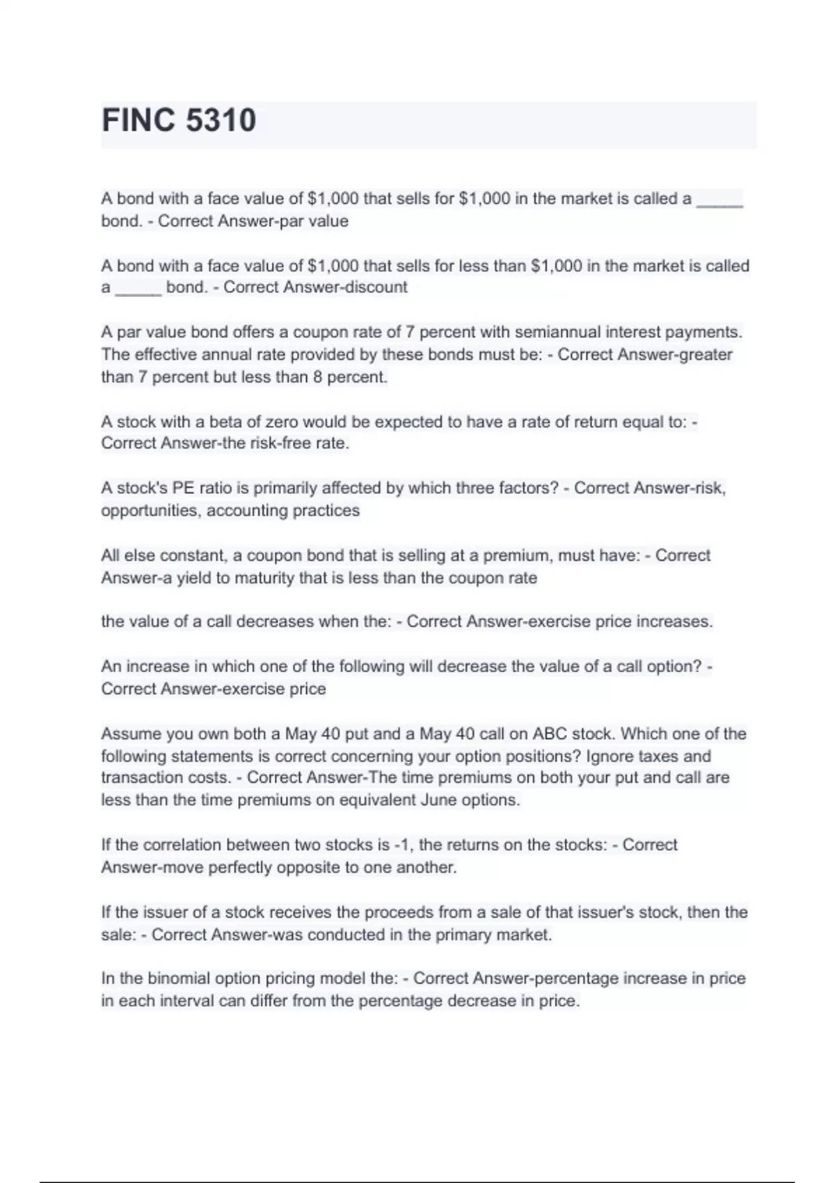FINC 5310 A bond with a face value of $1,000 that sells for $1,000 in the market is called a _____ bond. - Correct Answer-par value A bond with a face value of $1,000 that sells for less than $1,000 in the market is called a _____ bond. - Correct Answer-discount A par value bond offers a coupon rate of 7 percent with semiannual interest payments. The effective annual rate provided by these bonds must be: - Correct Answer-greater than 7 percent but less than 8 percent. A stock with a beta of zero would be expected to have a rate of return equal to: - Correct Answer-the risk-free rate. A stock's PE ratio is primarily affected by which three factors? - Correct Answer-risk, opportunities, accounting practices All else constant, a coupon bond that is selling at a premium, must have: - Correct Answer-a yield to maturity that is less than the coupon rate the value of a call decreases when the: - Correct Answer-exercise price increases. An increase in which one of the following will decrease the value of a call option? - Correct Answer-exercise price Assume you own both a May 40 put and a May 40 call on ABC stock. Which one of the following statements is correct concerning your option positions? Ignore taxes and transaction costs. - Correct Answer-The time premiums on both your put and call are less than the time premiums on equivalent June options.
