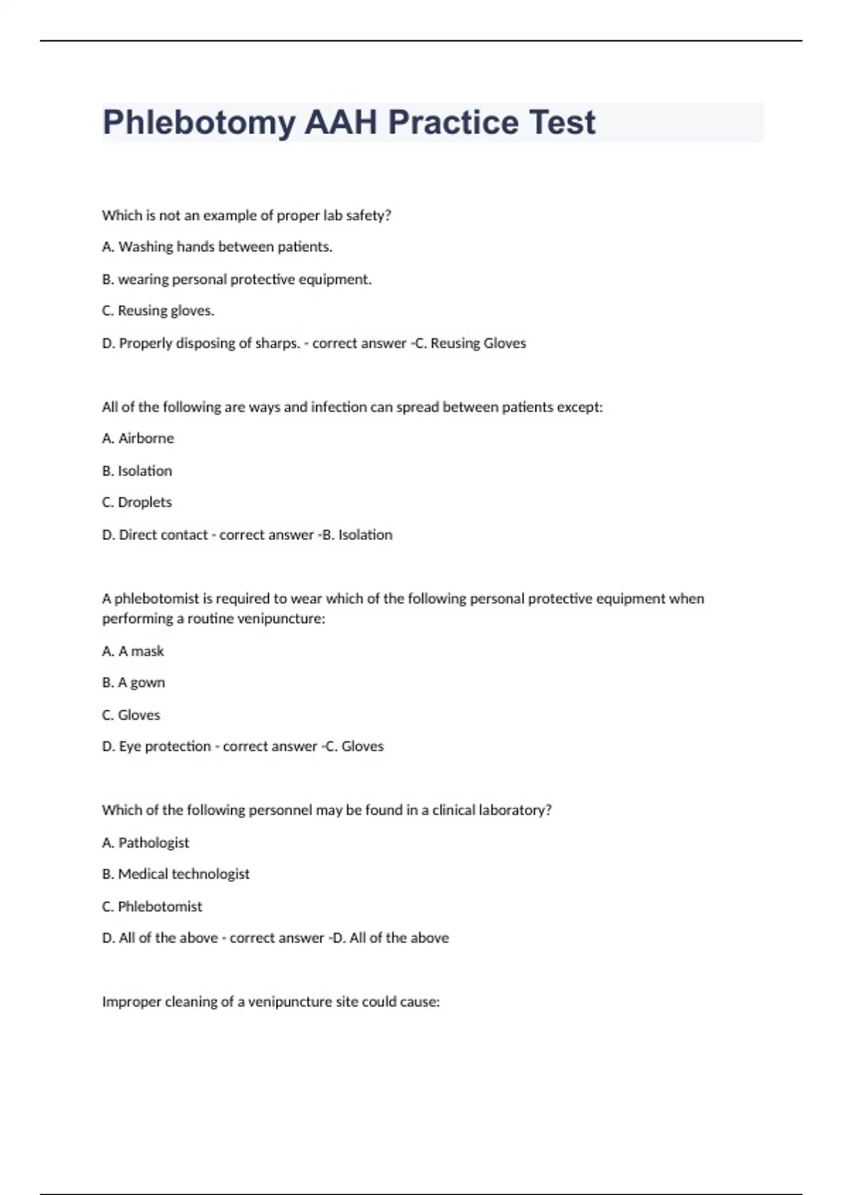 Which is not an example of proper lab safety? A. Washing hands between patients. B. wearing personal protective equipment. C. Reusing gloves. D. Properly disposing of sharps. C. Reusing Gloves All of the following are ways and infection can spread between patients except: A. Airborne B. Isolation C. Droplets D. Direct contact B. Isolation A phlebotomist is required to wear which of the following personal protective equipment when performing a routine venipuncture: A. A mask B. A gown C. Gloves D. Eye protection C. Gloves Which of the following personnel may be found in a clinical laboratory? A. Pathologist B. Medical technologist C. Phlebotomist D. All of the above D. All of the above Improper cleaning of a venipuncture site could cause: A. UTI B. Petechiae C. Septicemia D. Hematoma C. Septicemia What is the term for blood donated by a patient to be used for a planned future surgical operation? A. Autologous donation B. Blood typing C. Compatibility testing D. Directed donation A. Autologous donation Microorganisms that cause disease are considered: A. normal flora B. Bacterial C. Fungal D. All of the above D. All of the above