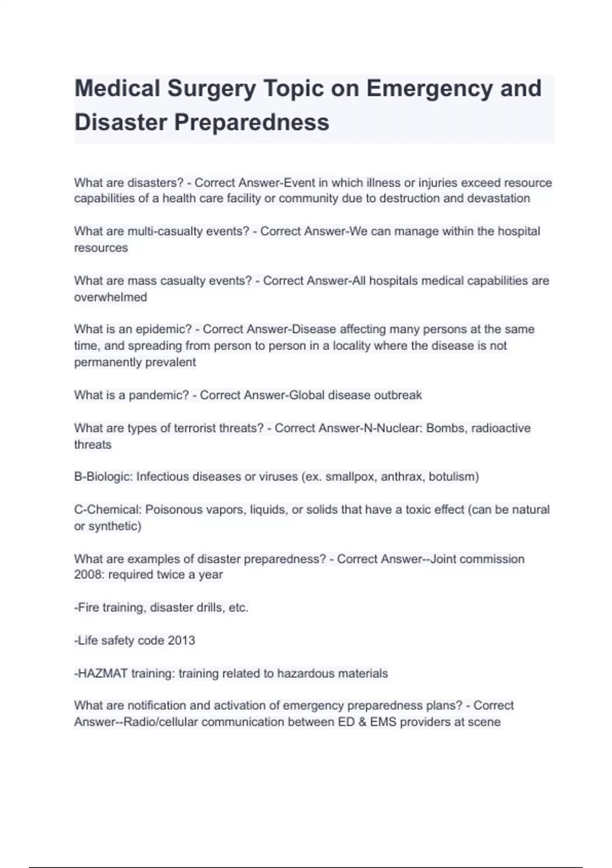 Medical Surgery Topic on Emergency and Disaster Preparedness What are disasters? - Correct Answer-Event in which illness or injuries exceed resource capabilities of a health care facility or community due to destruction and devastation What are multi-casualty events? - Correct Answer-We can manage within the hospital resources What are mass casualty events? - Correct Answer-All hospitals medical capabilities are overwhelmed What is an epidemic? - Correct Answer-Disease affecting many persons at the same time, and spreading from person to person in a locality where the disease is not permanently prevalent What is a pandemic? - Correct Answer-Global disease outbreak What are types of terrorist threats? - Correct Answer-N-Nuclear: Bombs, radioactive threats
