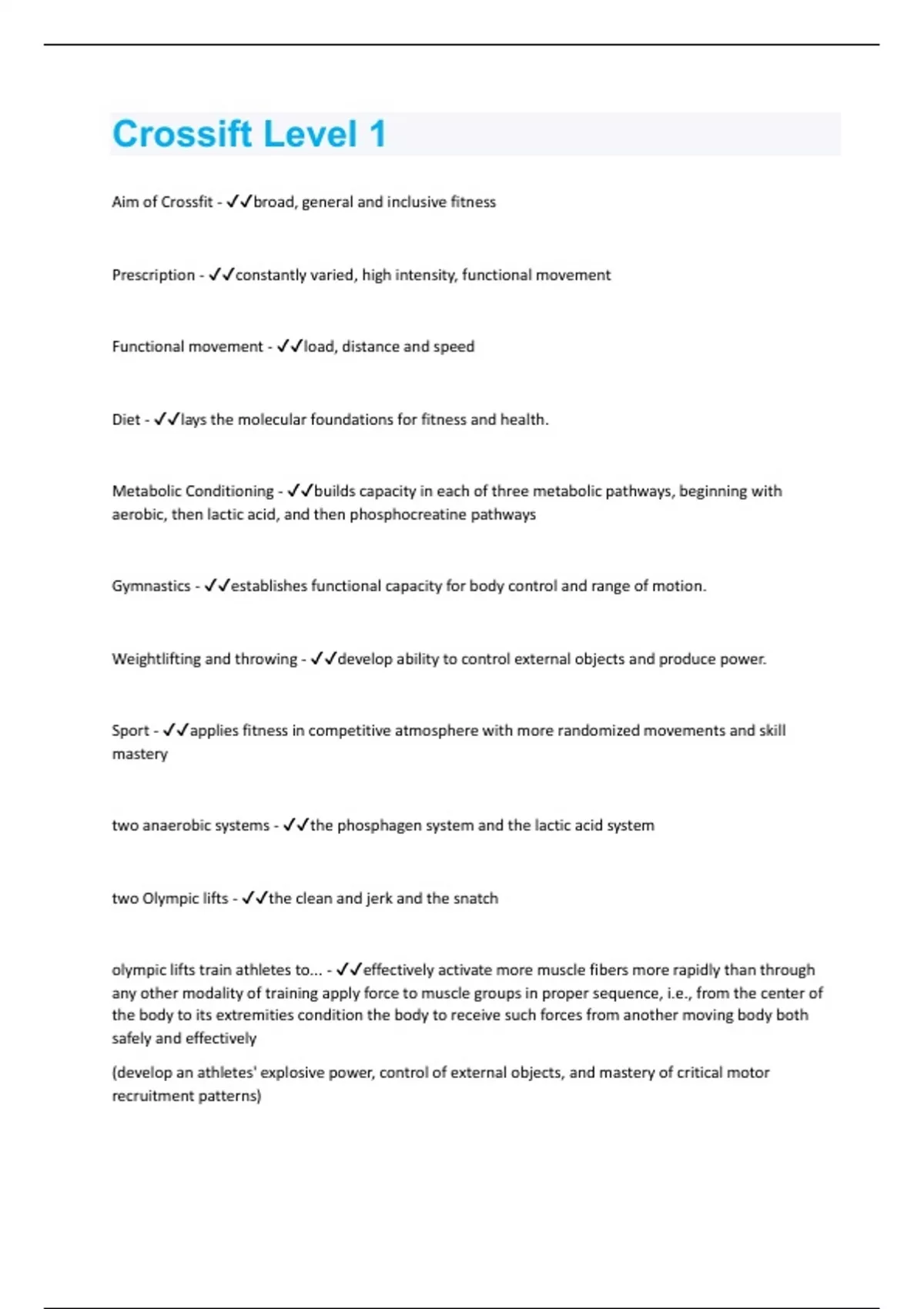 Aim of Crossfit - broad, general and inclusive fitness Prescription - constantly varied, high intensity, functional movement Functional movement - load, distance and speed Diet - lays the molecular foundations for fitness and health. Metabolic Conditioning - builds capacity in each of three metabolic pathways, beginning with aerobic, then lactic acid, and then phosphocreatine pathways Gymnastics - establishes functional capacity for body control and range of motion. Weightlifting and throwing - develop ability to control external objects and produce power. Sport - applies fitness in competitive atmosphere with more randomized movements and skill mastery two anaerobic systems - the phosphagen system and the lactic acid system two Olympic lifts - the clean and jerk and the snatch olympic lifts train athletes to... - effectively activate more muscle fibers more rapidly than through any other modality of training apply force to muscle groups in proper sequence, i.e., from the center of the body to its extremities condition the body to receive such forces from another moving body both safely and effectively (develop an athletes' explosive power, control of external objects, and mastery of critical motor recruitment patterns)