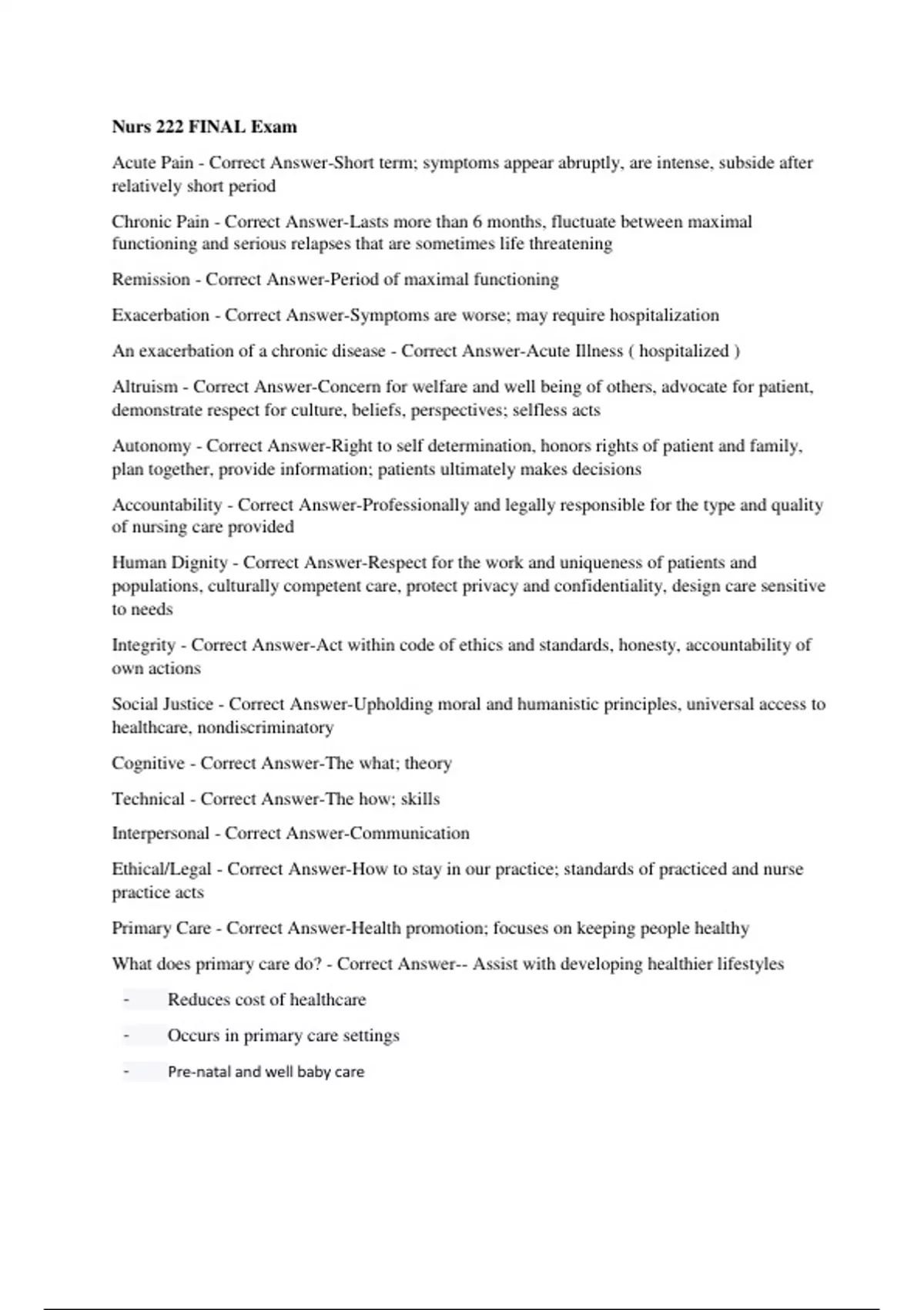 Nurs 222 FINAL Exam Acute Pain - Correct Answer-Short term; symptoms appear abruptly, are intense, subside after relatively short period Chronic Pain - Correct Answer-Lasts more than 6 months, fluctuate between maximal functioning and serious relapses that are sometimes life threatening Remission - Correct Answer-Period of maximal functioning Exacerbation - Correct Answer-Symptoms are worse; may require hospitalization An exacerbation of a chronic disease - Correct Answer-Acute Illness ( hospitalized ) Altruism - Correct Answer-Concern for welfare and well being of others, advocate for patient, demonstrate respect for culture, beliefs, perspectives; selfless acts Autonomy - Correct Answer-Right to self determination, honors rights of patient and family, plan together, provide information; patients ultimately makes decisions Accountability - Correct Answer-Professionally and legally responsible for the type and quality of nursing care provided Human Dignity - Correct Answer-Respect for the work and uniqueness of patients and populations, culturally competent care, protect privacy and confidentiality, design care sensitive to needs Integrity - Correct Answer-Act within code of ethics and standards, honesty, accountability of own actions