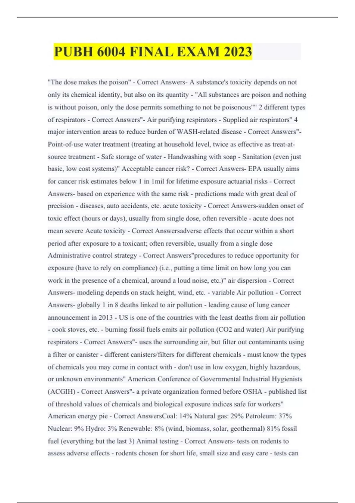 PUBH 6004 FINAL EXAM 2023 "The dose makes the poison" - Correct Answers- A substance's toxicity depends on not only its chemical identity, but also on its quantity - "All substances are poison and nothing is without poison, only the dose permits something to not be poisonous"" 2 different types of respirators - Correct Answers"- Air purifying respirators - Supplied air respirators" 4 major intervention areas to reduce burden of WASH-related disease - Correct Answers"- Point-of-use water treatment (treating at household level, twice as effective as treat-at-source treatment - Safe storage of water - Handwashing with soap - Sanitation (even just basic, low cost systems)" Acceptable cancer risk? - Correct Answers- EPA usually aims for cancer risk estimates below 1 in 1mil for lifetime exposure actuarial risks - Correct Answers- based on experience with the same risk - predictions made with great deal of precision - diseases, auto accidents, etc. acute toxicity - Correct Answers-sudden onset of toxic effect (hours or days), usually from single dose, often reversible - acute does not mean severe Acute toxicity - Correct Answersadverse effects that occur within a short period after exposure to a toxicant; often reversible, usually from a single dose Administrative control strategy - Correct Answers"procedures to reduce opportunity for exposure (have to rely on compliance) (i.e., putting a time limit on how long you can work in the presence of a chemical, around a loud noise, etc.)"