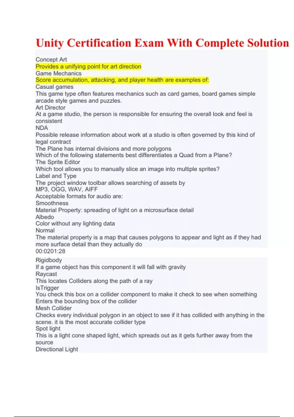 Unity Certification Exam With Complete Solution. Concept Art Provides a unifying point for art direction Game Mechanics Score accumulation, attacking, and player health are examples of: Casual games This game type often features mechanics such as card games, board games simple arcade style games and puzzles. Art Director At a game studio, the person is responsible for ensuring the overall look and feel is consistent NDA Possible release information about work at a studio is often governed by this kind of legal contract The Plane has internal divisions and more polygons Which of the following statements best differentiates a Quad from a Plane? The Sprite Editor Which tool allows you to manually slice an image into multiple sprites? Label and Type The project window toolbar allows searching of assets by MP3, OGG, WAV, AIFF Acceptable formats for audio are: Smoothness Material Property: spreading of light on a microsurface detail Albedo Color without any lighting data Normal The material property is a map that causes polygons to appear and light as if they had more surface detail than they actually do 00:0201:28 Rigidbody If a game object has this component it will fall with gravity Raycast This locates Colliders along the path of a ray IsTrigger You check this box on a collider component to make it check to see when something Enters the bounding box of the collider Mesh Collider Checks every individual polygon in an object to see if it has collided with anything in the scene. it is the most accurate collider type Spot light.