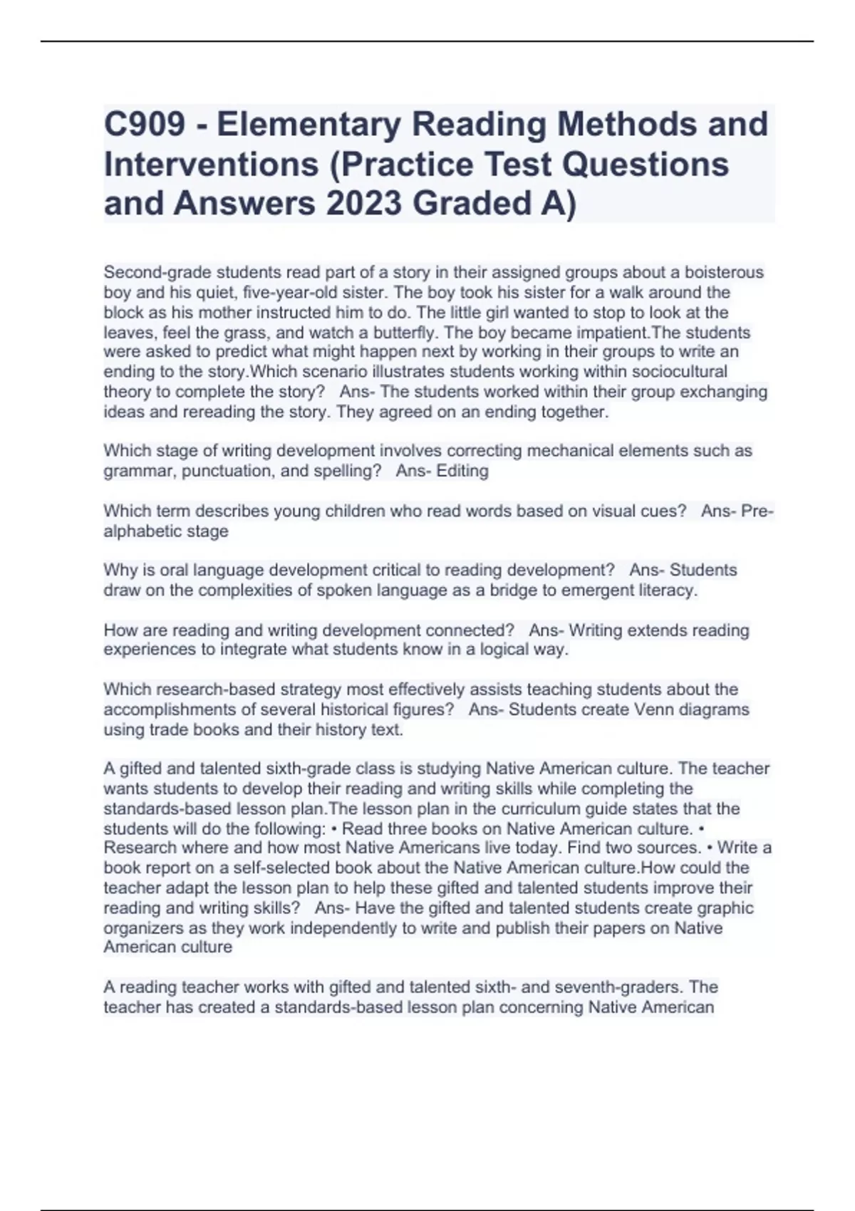 C909 - Elementary Reading Methods and Interventions (Practice Test Questions and Answers 2023 Graded A)