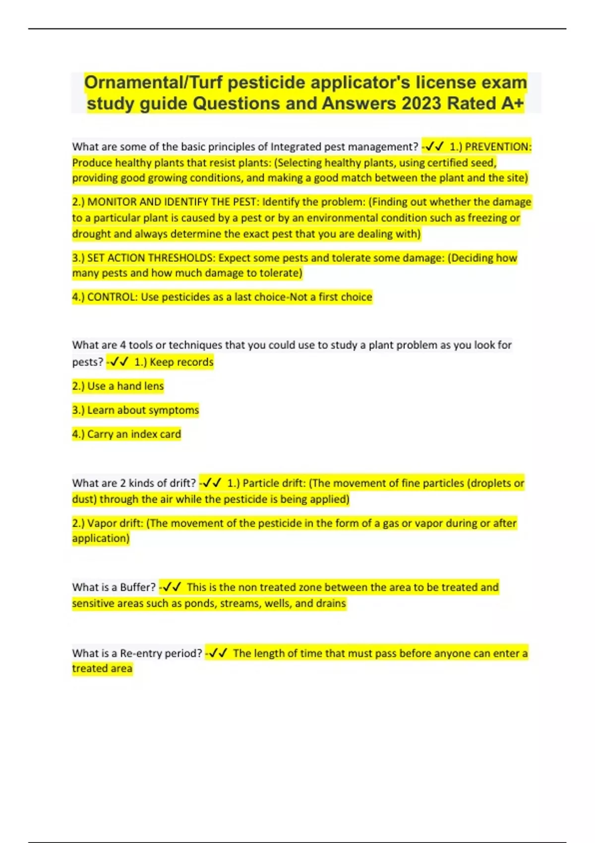 Ornamental/Turf pesticide applicator's license exam What are some of the basic principles of Integrated pest management? - 1.) PREVENTION: Produce healthy plants that resist plants: (Selecting healthy plants, using certified seed, providing good growing conditions, and making a good match between the plant and the site) 2.) MONITOR AND IDENTIFY THE PEST: Identify the problem: (Finding out whether the damage to a particular plant is caused by a pest or by an environmental condition such as freezing or drought and always determine the exact pest that you are dealing with) 3.) SET ACTION THRESHOLDS: Expect some pests and tolerate some damage: (Deciding how many pests and how much damage to tolerate) 4.) CONTROL: Use pesticides as a last choice-Not a first choice What are 4 tools or techniques that you could use to study a plant problem as you look for pests? - 1.) Keep records 2.) Use a hand lens 3.) Learn about symptoms 4.) Carry an index card