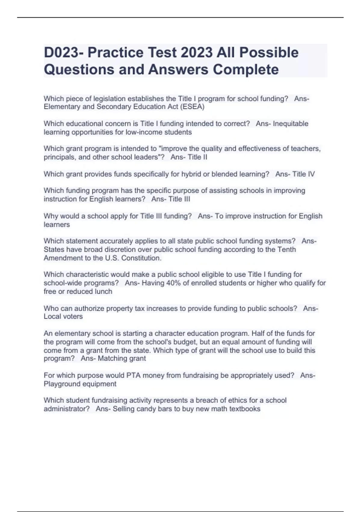 D023- Practice Test 2023 All Possible Questions and Answers Complete