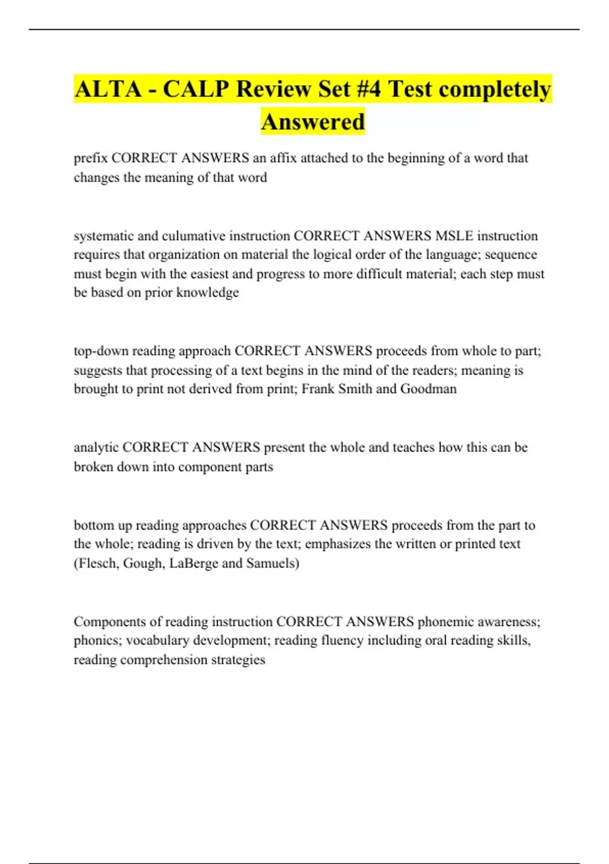 ALTA - CALP Review Set #4 Test completely Answered prefix systematic and culumative instruction top-down reading approach analytic bottom up reading approaches Components of reading instruction diagnostic teaching direct instruction language experience linguistic method base word suffix affix derivative [-'le Open syllable