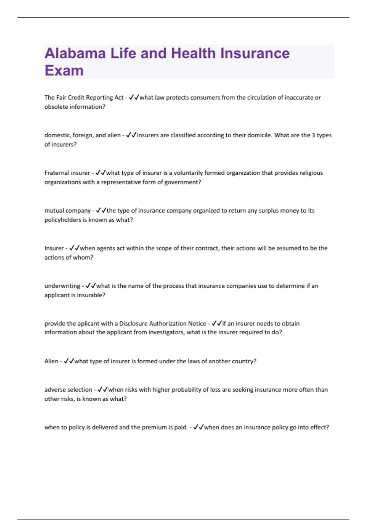 Alabama Life and Health Insurance | 50 Questions and Answers with complete solution