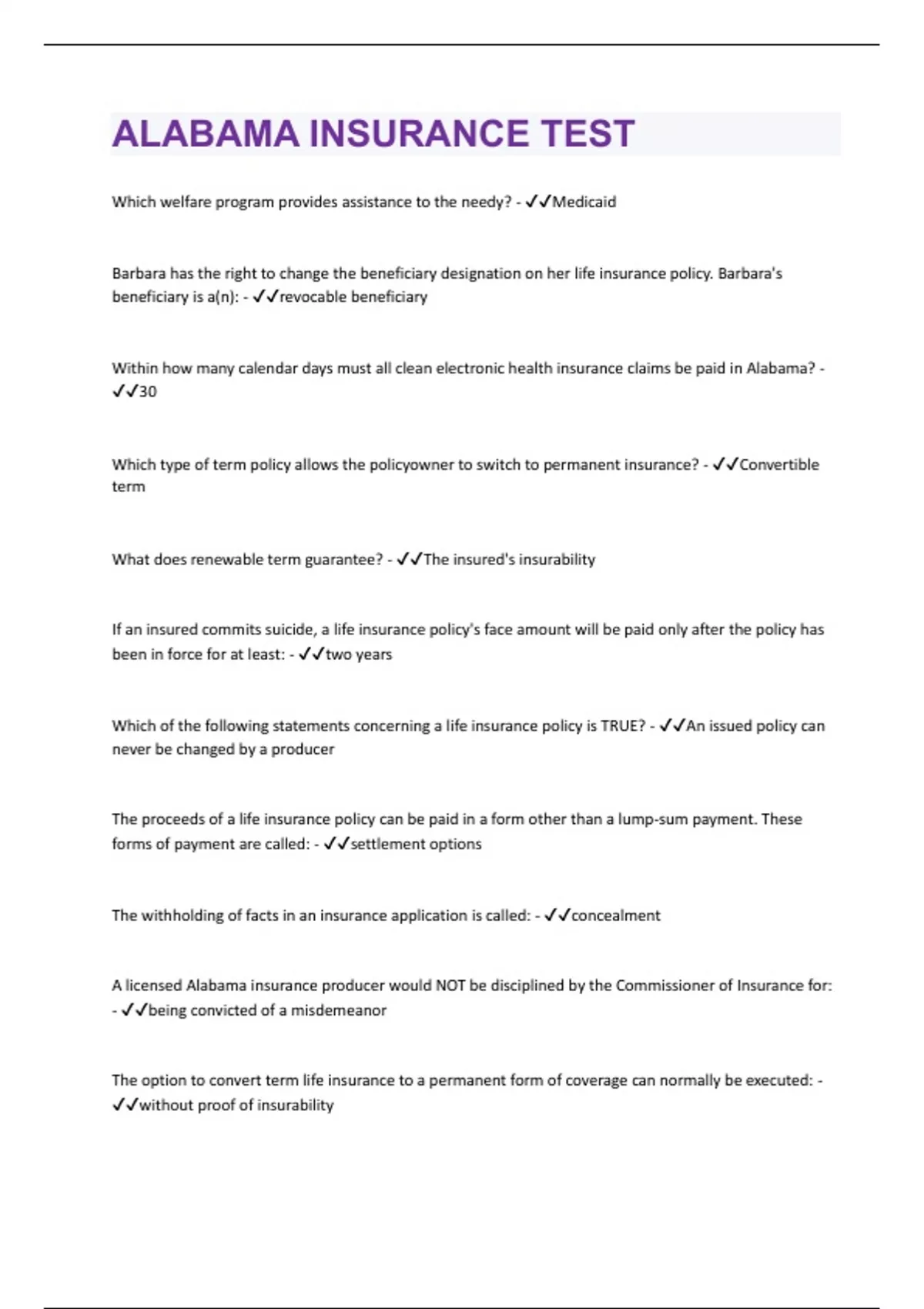 Which welfare program provides assistance to the needy? - Medicaid Barbara has the right to change the beneficiary designation on her life insurance policy. Barbara's beneficiary is a(n): - revocable beneficiary Within how many calendar days must all clean electronic health insurance claims be paid in Alabama? - 30 Which type of term policy allows the policyowner to switch to permanent insurance? - Convertible term What does renewable term guarantee? - The insured's insurability If an insured commits suicide, a life insurance policy's face amount will be paid only after the policy has been in force for at least: - two years Which of the following statements concerning a life insurance policy is TRUE? - An issued policy can never be changed by a producer The proceeds of a life insurance policy can be paid in a form other than a lump-sum payment. These forms of payment are called: - settlement options The withholding of facts in an insurance application is called: - concealment A licensed Alabama insurance producer would NOT be disciplined by the Commissioner of Insurance for: - being convicted of a misdemeanor The option to convert term life insurance to a permanent form of coverage can normally be executed: - without proof of insurability