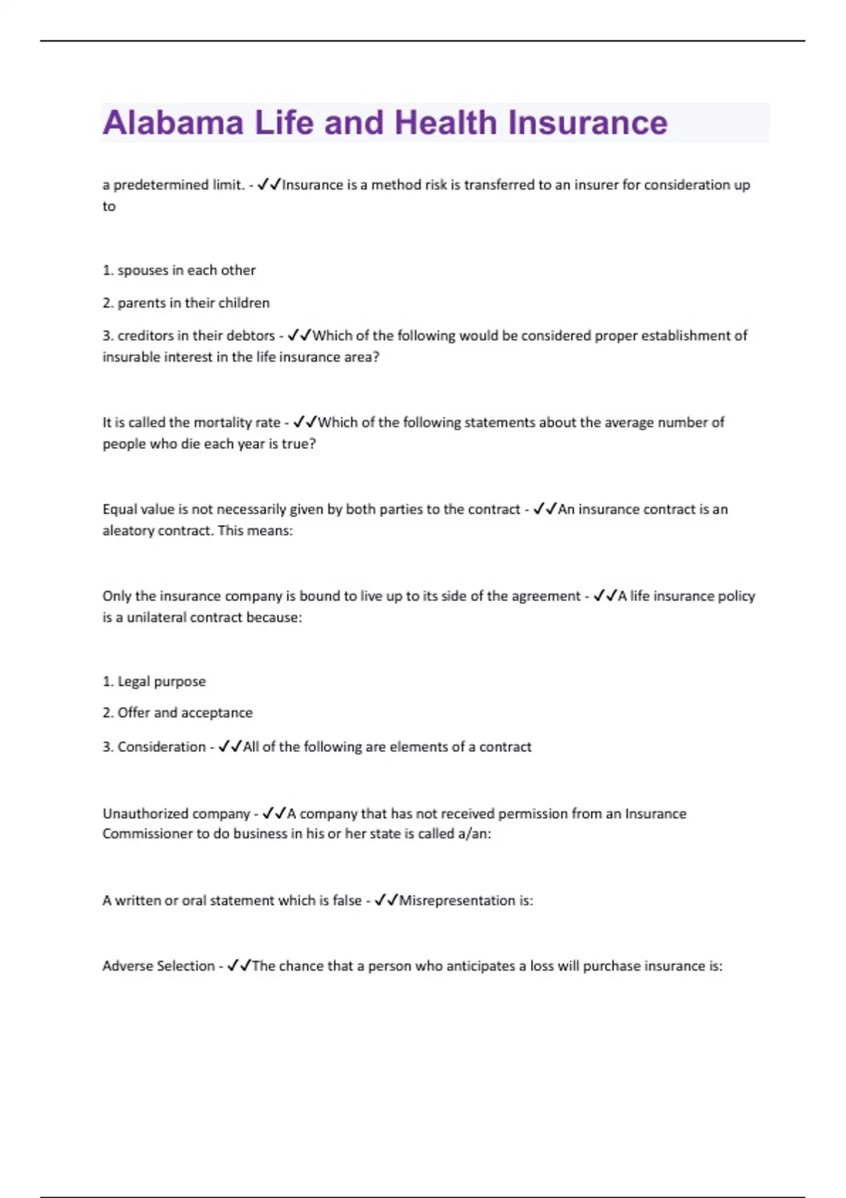 a predetermined limit. - Insurance is a method risk is transferred to an insurer for consideration up to 1. spouses in each other 2. parents in their children 3. creditors in their debtors - Which of the following would be considered proper establishment of insurable interest in the life insurance area? It is called the mortality rate - Which of the following statements about the average number of people who die each year is true? Equal value is not necessarily given by both parties to the contract - An insurance contract is an aleatory contract. This means: Only the insurance company is bound to live up to its side of the agreement - A life insurance policy is a unilateral contract because: 1. Legal purpose 2. Offer and acceptance 3. Consideration - All of the following are elements of a contract Unauthorized company - A company that has not received permission from an Insurance Commissioner to do business in his or her state is called a/an: A written or oral statement which is false - Misrepresentation is: Adverse Selection - The chance that a person who anticipates a loss will purchase insurance is:Assumption of risk - Assuming a deductible with your insurance policy is which type of risk management technique?