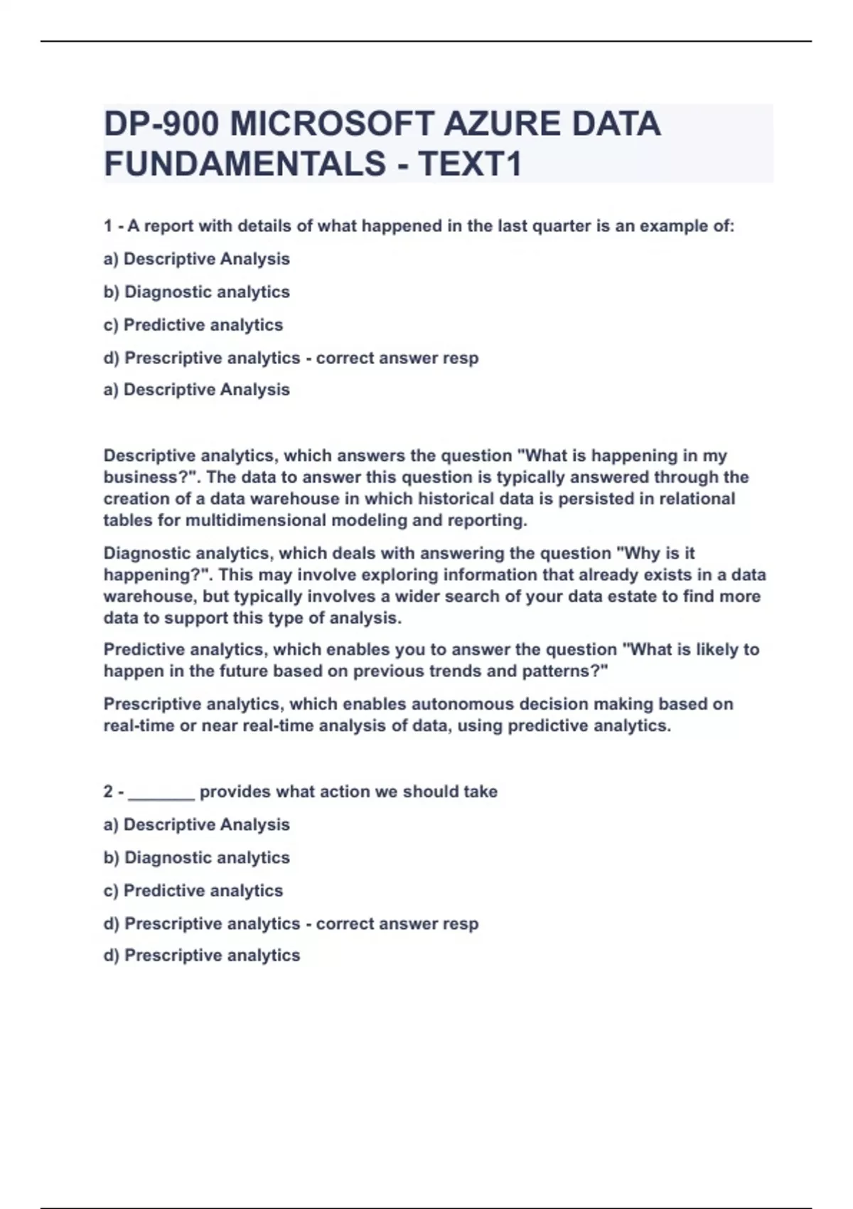 1 - A report with details of what happened in the last quarter is an example of: a) Descriptive Analysis b) Diagnostic analytics c) Predictive analytics d) Prescriptive analytics resp a) Descriptive Analysis Descriptive analytics, which answers the question "What is happening in my business?". The data to answer this question is typically answered through the creation of a data warehouse in which historical data is persisted in relational tables for multidimensional modeling and reporting. Diagnostic analytics, which deals with answering the question "Why is it happening?". This may involve exploring information that already exists in a data warehouse, but typically involves a wider search of your data estate to find more data to support this type of analysis. Predictive analytics, which enables you to answer the question "What is likely to happen in the future based on previous trends and patterns?" Prescriptive analytics, which enables autonomous decision making based on real-time or near real-time analysis of data, using predictive analytics. 2 - _______ provides what action we should take a) Descriptive Analysis b) Diagnostic analytics c) Predictive analytics d) Prescriptive analytics resp d) Prescriptive analytics Descriptive analytics, which answers the question "What is happening in my business?". The data to answer this question is typically answered through the creation of a data warehouse in which historical data is persisted in relational tables for multidimensional modeling and reporting. Diagnostic analytics, which deals with answering the question "Why is it happening?". This may involve exploring information that already exists in a data warehouse, but typically involves a wider search of your data estate to find more data to support this type of analysis. Predictive analytics, which enables you to answer the question "What is likely to happen in the future based on previous trends and patterns?" Prescriptive analytics, which enables autonomous decision making based on real-time or near real-time analysis of data, using predictive analytics. 3 - Converting speech to text is an example of ___________ a) Descriptive Analysis b) Diagnostic analytics c) Cognitive analytics d) Prescriptive analytics resp c) Cognitive analytics 4 - Analyzing why car sales are down in the last quarter comes under ______________ a) Descriptive Analysis b) Diagnostic analytics c) Predictive analytics d) Prescriptive analytics resp b) Diagnostic analytics Descriptive analytics, which answers the question "What is happening in my business?". The data to answer this question is typically answered through the creation of a data warehouse in which historical data is persisted in relational tables for multidimensional modeling and reporting. Diagnostic analytics, which deals with answering the question "Why is it happening?". This may involve exploring information that already exists in a data warehouse, but typically involves a wider search of your data estate to find more data to support this type of analysis. Predictive analytics, which enables you to answer the question "What is likely to happen in the future based on previous trends and patterns?" Prescriptive analytics, which enables autonomous decision making based on real-time or near real-time analysis of data, using predictive analytics. 5 - Pie Chart showing number of tickets bought vs seating capacity of a movie theater is example of _______________ a) Descriptive Analysis b) Diagnostic analytics c) Predictive analytics d) Prescriptive analytics resp a) Descriptive Analysis Descriptive analytics, which answers the question "What is happening in my business?". The data to answer this question is typically answered through the creation of a data warehouse in which historical data is persisted in relational tables for multidimensional modeling and reporting. Diagnostic analytics, which deals with answering the question "Why is it happening?". This may involve exploring information that already exists in a data warehouse, but typically involves a wider search of your data estate to find more data to support this type of analysis. Predictive analytics, which enables you to answer the question "What is likely to happen in the future based on previous trends and patterns?" Prescriptive analytics, which enables autonomous decision making based on real-time or near real-time analysis of data, using predictive analytics. 6 - Which of these can you use to analyze if a retail company has sufficient stock of products to meet the demand on Black Friday? a) Descriptive Analysis b) Diagnostic analytics c) Predictive analytics d) Prescriptive analytics resp c) Predictive analytics 7 - In ELT (Extract, Load and Transform): a) Data is first loaded into the target datastore with minimal processing b) Transformations are done in the target datastore c) We do NOT use separate service for transformation d) All of above resp d) All of above 8 - TRUE OR FALSE: Batch Processing commences when a condition is met a) True b) False resp a) True 9 - Which of the following is TRUE about Batch processing? a) Data is processed near realtime b) Can NOT process huge loads of data c) Parallel Processing is NOT possible d) Batch processing typically has high latency resp d) Batch processing typically has high latency 10 - Temperature sensors sending readings every hour is example of _________ a) Batch Processing b) Stream processing resp a) Batch Processing 11 - Payment transactions from a POS terminal sent to Event Hubs is an example of _______ a) Batch Processing b) Stream processing resp b) Stream processing 12 - TRUE OR FALSE: When using Azure Data Factory for batch processing, processed data can be stored in relational databases, NoSql databases or in Azure Blob Storage a) True b) False resp a) True 13 - Most frequently used data model schema for data analysis (in a data warehouse) is ________________ a) Star Schema b) Transactional Data Model c) Dimension d) None of the abo