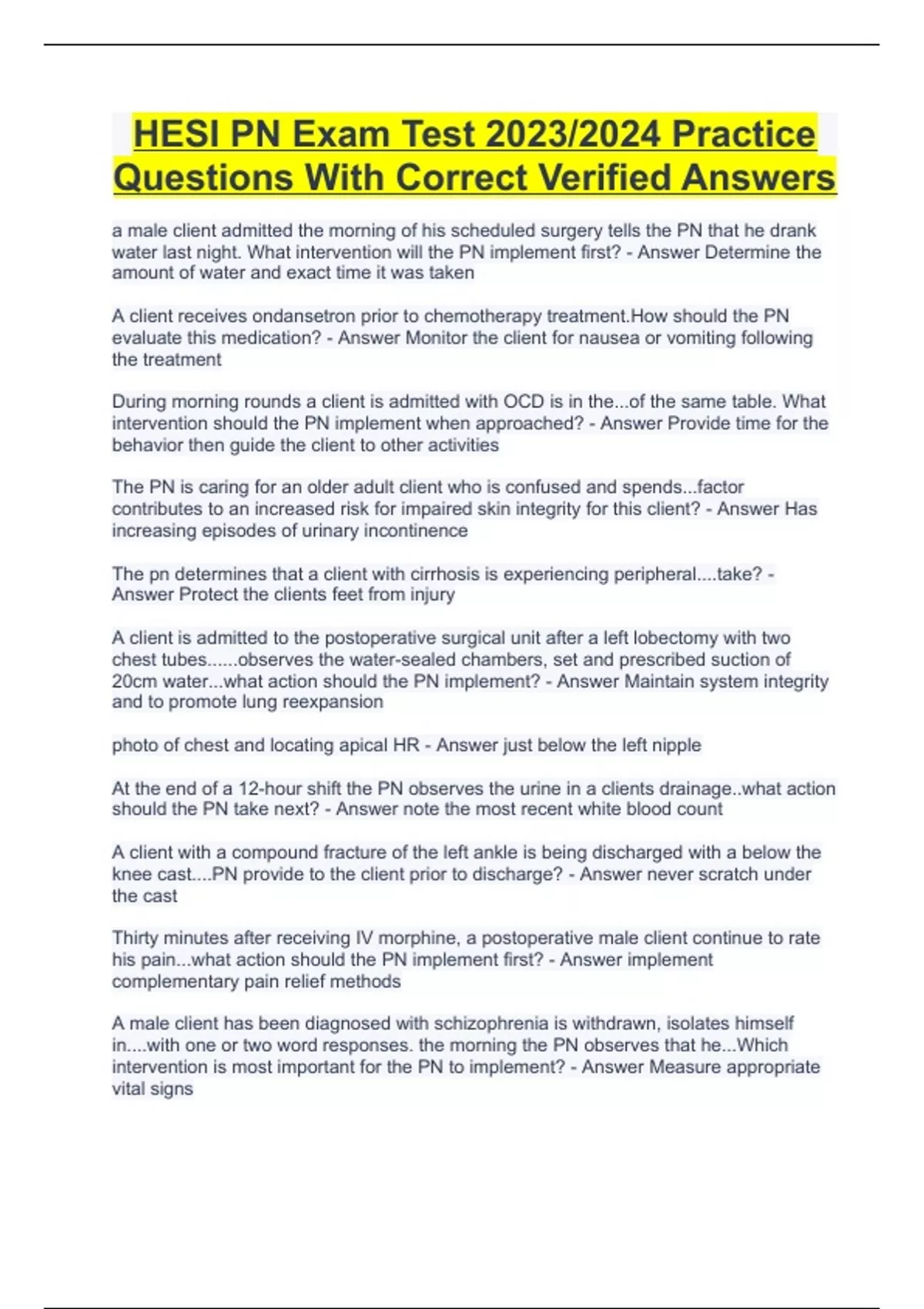 HESI PN Exam Test 2023/2024 Practice Questions With Correct Verified Answers