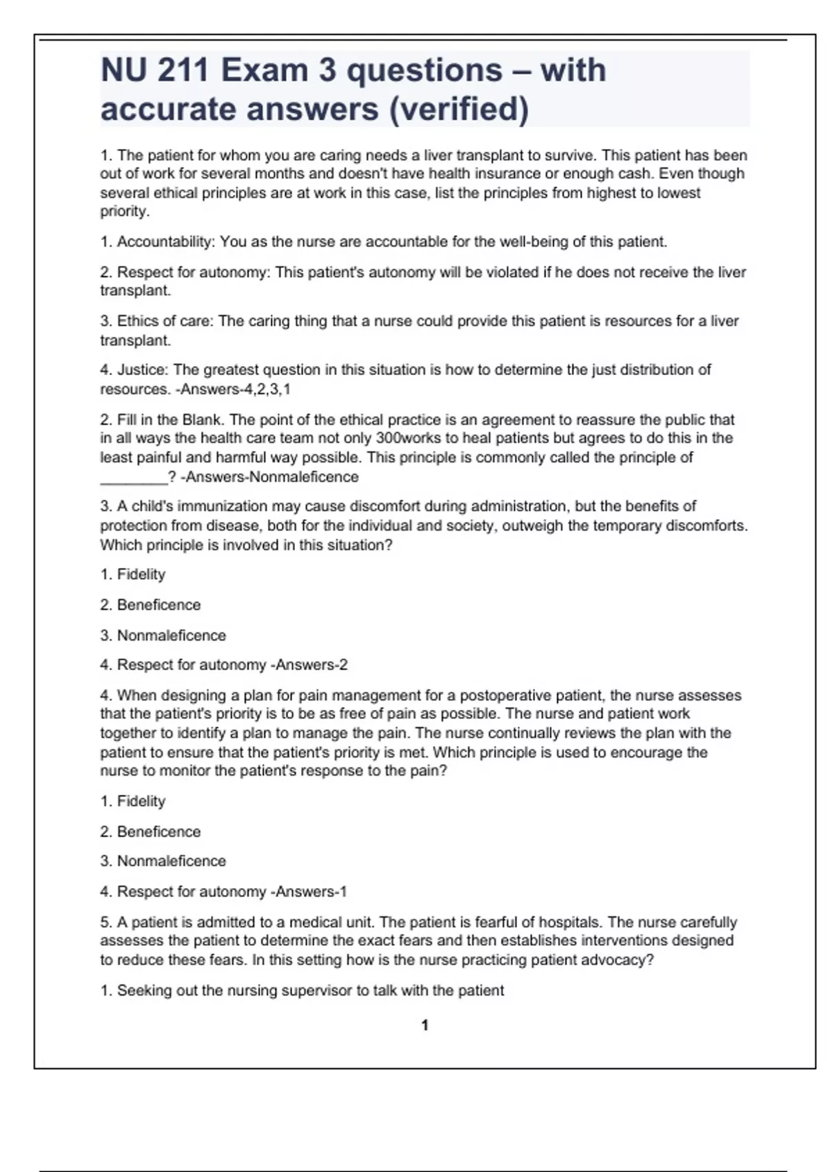 1. The patient for whom you are caring needs a liver transplant to survive. This patient has been out of work for several months and doesn't have health insurance or enough cash. Even though several ethical principles are at work in this case, list the principles from highest to lowest priority. 1. Accountability: You as the nurse are accountable for the well-being of this patient. 2. Respect for autonomy: This patient's autonomy will be violated if he does not receive the liver transplant. 3. Ethics of care: The caring thing that a nurse could provide this patient is resources for a liver transplant. 4. Justice: The greatest question in this situation is how to determine the just distribution of resources. -Answers-4,2,3,1 2. Fill in the Blank. The point of the ethical practice is an agreement to reassure the public that in all ways the health care team not only 300works to heal patients but agrees to do this in the least painful and harmful way possible. This principle is commonly called the principle of ________? -Answers-Nonmaleficence