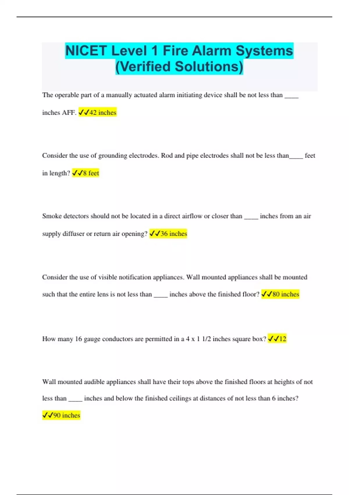NICET Level 1 Fire Alarm Systems (Verified Solutions) The operable part of a manually actuated alarm initiating device shall be not less than ____ inches AFF. 42 inches Consider the use of grounding electrodes. Rod and pipe electrodes shall not be less than____ feet in length? 8 feet Smoke detectors should not be located in a direct airflow or closer than ____ inches from an air supply diffuser or return air opening? 36 inches Consider the use of visible notification appliances. Wall mounted appliances shall be mounted such that the entire lens is not less than ____ inches above the finished floor? 80 inches How many 16 gauge conductors are permitted in a 4 x 1 1/2 inches square box? 12 Wall mounted audible appliances shall have their tops above the finished floors at heights of not less than ____ inches and below the finished ceilings at distances of not less than 6 inches? 90 inches A minimum ____ db ambient sound level with a 6 hour exposure time requires hearing protection? 92 db Spot type heat sensing fire detectors shall be located on the ceiling not less than ____ inches from the sidewall. 4 inches While operating an aerial lift, the use of a body harnes and ____ is not required? Stabilizer Hook, Grounding Pole, Insulation Mat Spot type smoke detectors shall be located on the ceiling or, if on a sidewall, between the ceiling and ____ inches down from the ceiling to the top of the detector. 12 inches The distance between spot type heat detectors shall not exceed their listed spacing, and there shall be detectors within a distance of ____ the listed spacing, measured at right angles from the walls? One Half Where partitions extend to within ____ percent of the ceiling height, the spaces separated by the partitions shall be considered as separate rooms? 15 percent Consider 1,000 feet total of 18 gauge soild coated copper at 167o Fahrenheit. The resistance of this conductor is ____ ohm? 8.08 ohm Consider the installation of heat detectors on a ceiling with beams. A ceiling shall be treated as a smooth ceiling if the beams project no more than____ inches