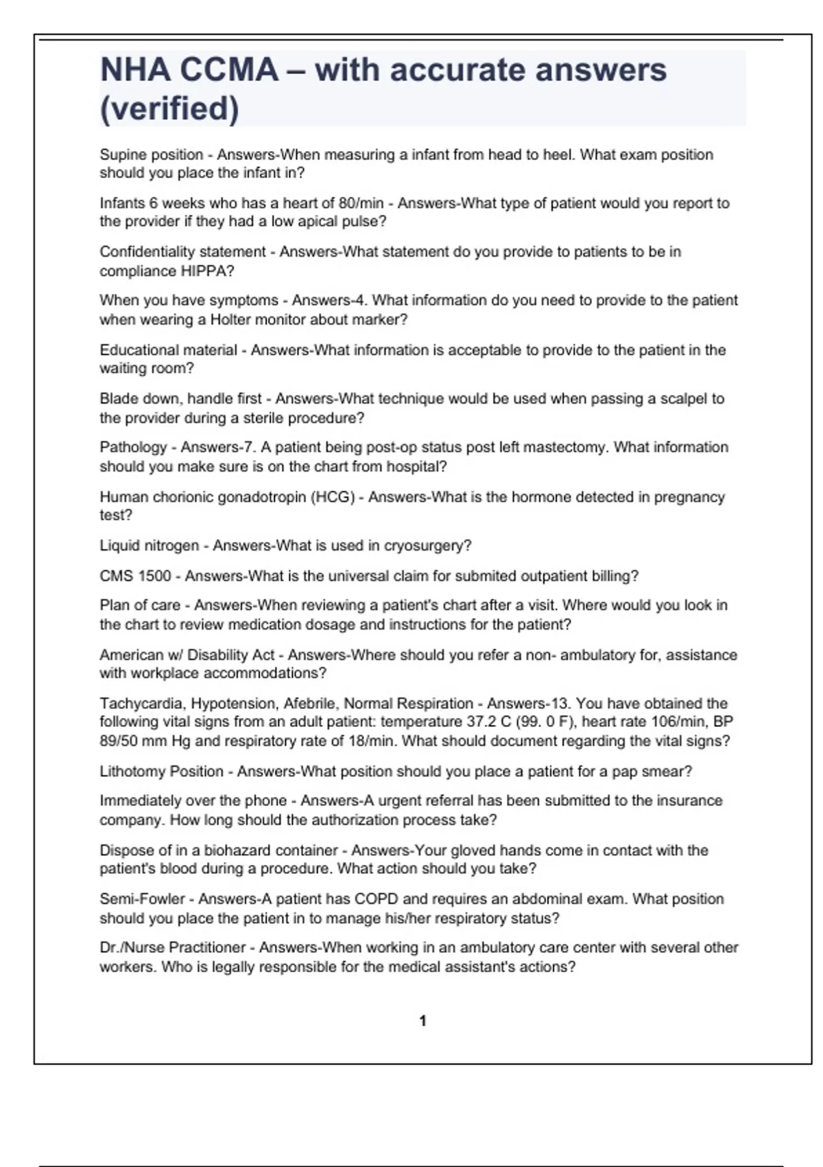 Supine position - Answers-When measuring a infant from head to heel. What exam position should you place the infant in? Infants 6 weeks who has a heart of 80/min - Answers-What type of patient would you report to the provider if they had a low apical pulse? Confidentiality statement - Answers-What statement do you provide to patients to be in compliance HIPPA? When you have symptoms - Answers-4. What information do you need to provide to the patient when wearing a Holter monitor about marker? Educational material - Answers-What information is acceptable to provide to the patient in the waiting room? Blade down, handle first - Answers-What technique would be used when passing a scalpel to the provider during a sterile procedure? Pathology - Answers-7. A patient being post-op status post left mastectomy. What information should you make sure is on the chart from hospital? Human chorionic gonadotropin (HCG) - Answers-What is the hormone detected in pregnancy test? Liquid nitrogen - Answers-What is used in cryosurgery? CMS 1500 - Answers-What is the universal claim for submited outpatient billing? Plan of care - Answers-When reviewing a patient's chart after a visit. Where would you look in the chart to review medication dosage and instructions for the patient? American w/ Disability Act - Answers-Where should you refer a non- ambulatory for, assistance with workplace accommodations? Tachycardia, Hypotension, Afebrile, Normal Respiration - Answers-13. You have obtained the following vital signs from an adult patient: temperature 37.2 C (99. 0 F), heart rate 106/min, BP 89/50 mm Hg and respiratory rate of 18/min. What should document regarding the vital signs? Lithotomy Position - Answers-What position should you place a patient for a pap smear? Immediately over the phone - Answers-A urgent referral has been submitted to the insurance company. How long should the authorization process take? Dispose of in a biohazard container - Answers-Your gloved hands come in contact with the patient's blood during a procedure. What action should you take? Semi-Fowler - Answers-A patient has COPD and requires an abdominal exam. What position should you place the patient in to manage his/her respiratory status? Dr./Nurse Practitioner - Answers-When working in an ambulatory care center with several other workers. Who is legally responsible for the medical assistant's actions? Patient & care giver relationship - Answers-What should you recognize as a goal of patient- centered care? Alc