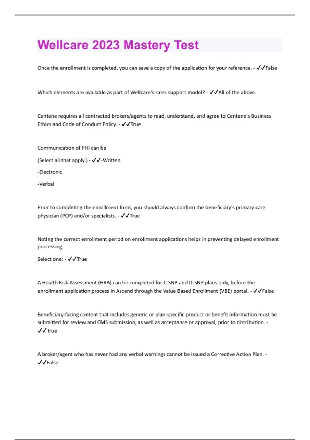 Once the enrollment is completed, you can save a copy of the application for your reference. - False Which elements are available as part of Wellcare's sales support model? - All of the above. Centene requires all contracted brokers/agents to read, understand, and agree to Centene's Business Ethics and Code of Conduct Policy. - True Communication of PHI can be: (Select all that apply.) - -Written -Electronic -Verbal Prior to completing the enrollment form, you should always confirm the beneficiary's primary care physician (PCP) and/or specialists. - True Noting the correct enrollment period on enrollment applications helps in preventing delayed enrollment processing. Select one: - True A Health Risk Assessment (HRA) can be completed for C-SNP and D-SNP plans only, before the enrollment application process in Ascend through the Value Based Enrollment (VBE) portal. - False Beneficiary-facing content that includes generic or plan-specific product or benefit information must be submitted for review and CMS submission, as well as acceptance or approval, prior to distribution. - True A broker/agent who has never had any verbal warnings cannot be issued a Corrective Action Plan. - FalseThe NEW online Centene Workbench self-service portal enables you to: - All of the above
