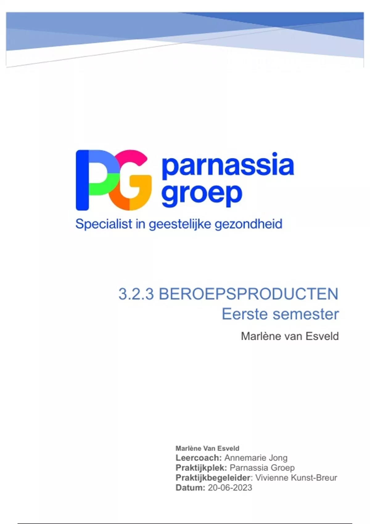 Voor de opleiding Social work profiel langdurig complexe zorg (LCZ) heb ik drie verschillende beroepsproducten uitgevoerd op mijn stage. Deze staan beschreven met verantwoording en reflectie in dit document. Voor dit verslag heb ik een 7,6 behaald! Leerjaar