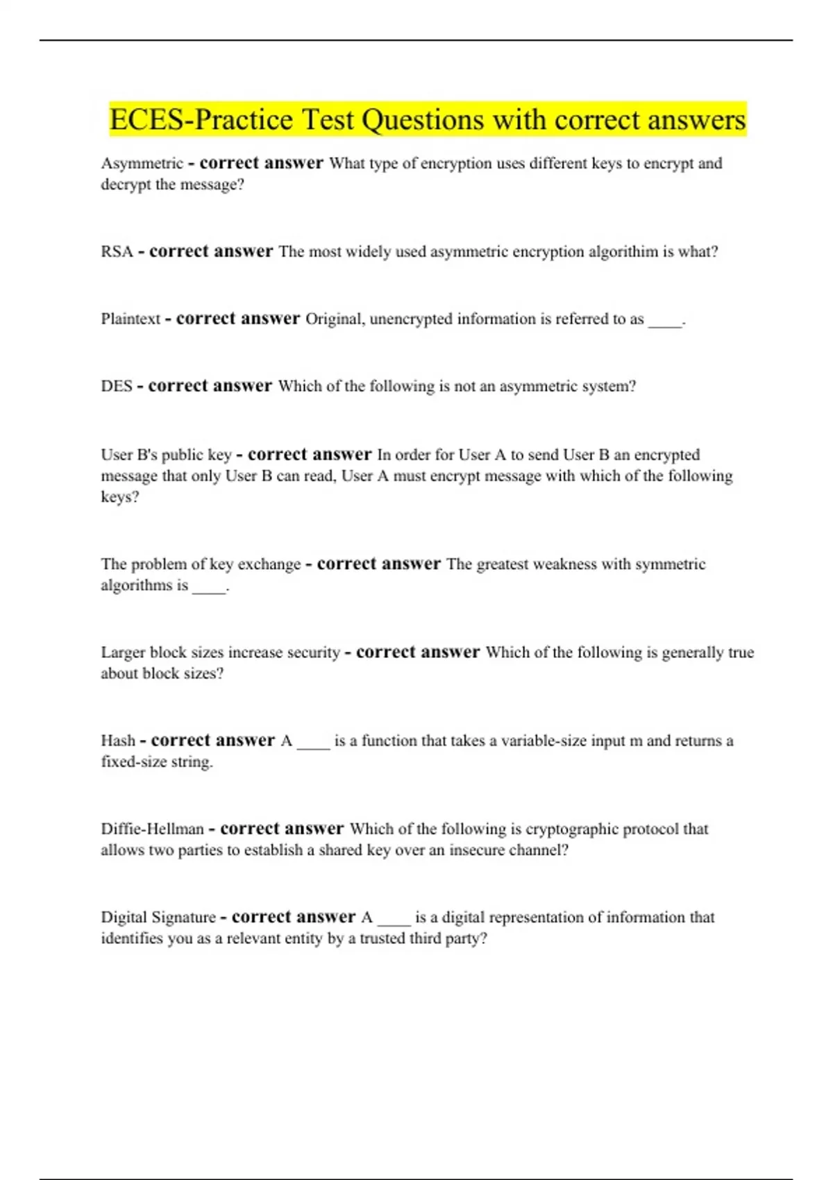 Asymmetric - correct answer What type of encryption uses different keys to encrypt and decrypt the message? RSA - correct answer The most widely used asymmetric encryption algorithim is what? Plaintext - correct answer Original, unencrypted information is referred to as ____. DES - correct answer Which of the following is not an asymmetric system? User B's public key - correct answer In order for User A to send User B an encrypted message that only User B can read, User A must encrypt message with which of the following keys? The problem of key exchange - correct answer The greatest weakness with symmetric algorithms is ____. Larger block sizes increase security - correct answer Which of the following is generally true about block sizes? Hash - correct answer A ____ is a function that takes a variable-size input m and returns a fixed-size string. Diffie-Hellman - correct answer Which of the following is cryptographic protocol that allows two parties to establish a shared key over an insecure
