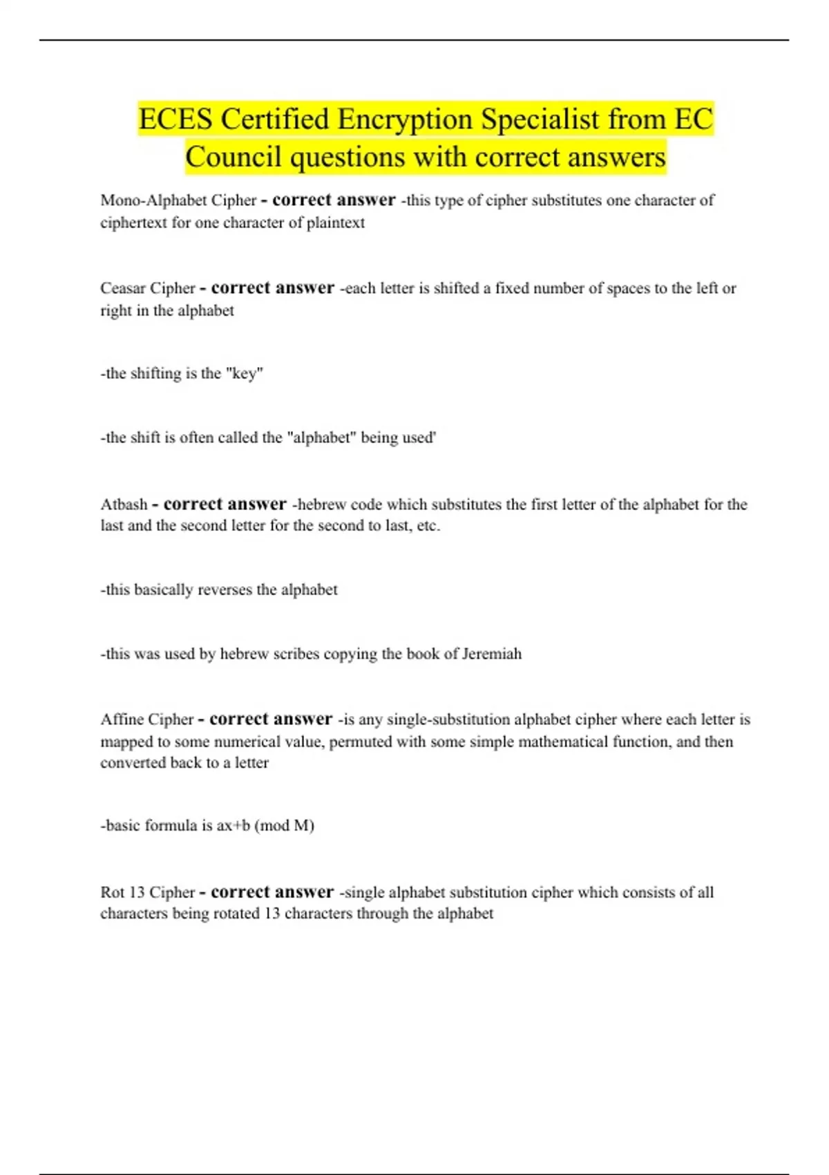 Mono-Alphabet Cipher - correct answer -this type of cipher substitutes one character of ciphertext for one character of plaintext Ceasar Cipher - correct answer -each letter is shifted a fixed number of spaces to the left or right in the alphabet -the shifting is the "key" -the shift is often called the "alphabet" being used' Atbash - correct answer -hebrew code which substitutes the first letter of the alphabet for the last and the second letter for the second to last, etc. -this basically reverses the alphabet -this was used by hebrew scribes copying the book of Jeremiah Affine Cipher - correct answer -is any single-substitution alphabet cipher where each letter is mapped to some numerical value, permuted with some simple mathematical function, and then converted back to a letter -basic formula is ax+b (mod M) Rot 13 Cipher - correct answer -single alphabet substitution cipher which consists of all characters being rotated 13 characters through the alphabet