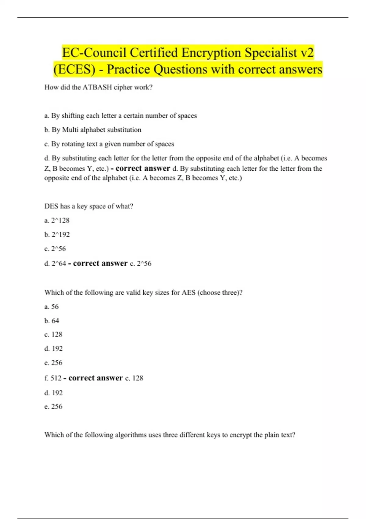 How did the ATBASH cipher work? a. By shifting each letter a certain number of spaces b. By Multi alphabet substitution c. By rotating text a given number of spaces d. By substituting each letter for the letter from the opposite end of the alphabet (i.e. A becomes Z, B becomes Y, etc.) - correct answer d. By substituting each letter for the letter from the opposite end of the alphabet (i.e. A becomes Z, B becomes Y, etc.) DES has a key space of what? a. 2^128 b. 2^192 c. 2^56 d. 2^64 - correct answer c. 2^56 Which of the following are valid key sizes for AES (choose three)? a. 56 b. 64 c. 128 d. 192 e. 256 f. 512 - correct answer c. 128 d. 192 e. 256