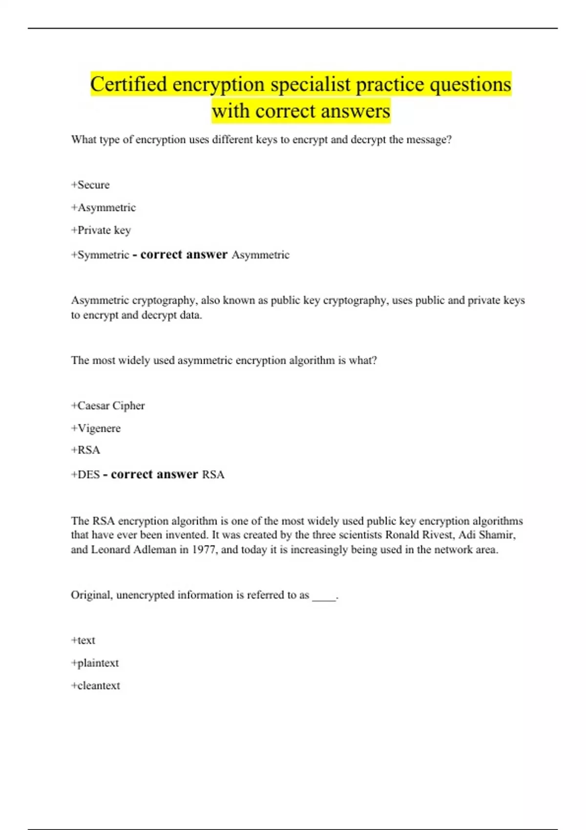 What type of encryption uses different keys to encrypt and decrypt the message? +Secure +Asymmetric +Private key +Symmetric - correct answer Asymmetric Asymmetric cryptography, also known as public key cryptography, uses public and private keys to encrypt and decrypt data. The most widely used asymmetric encryption algorithm is what? +Caesar Cipher +Vigenere +RSA +DES - correct answer RSA The RSA encryption algorithm is one of the most widely used public key encryption algorithms that have ever been invented. It was created by the three scientists Ronald Rivest, Adi Shamir, and Leonard Adleman in 1977, and today it is increasingly being used in the network area. Original, unencrypted information is referred to as ____. +text +plaintext +cleantext