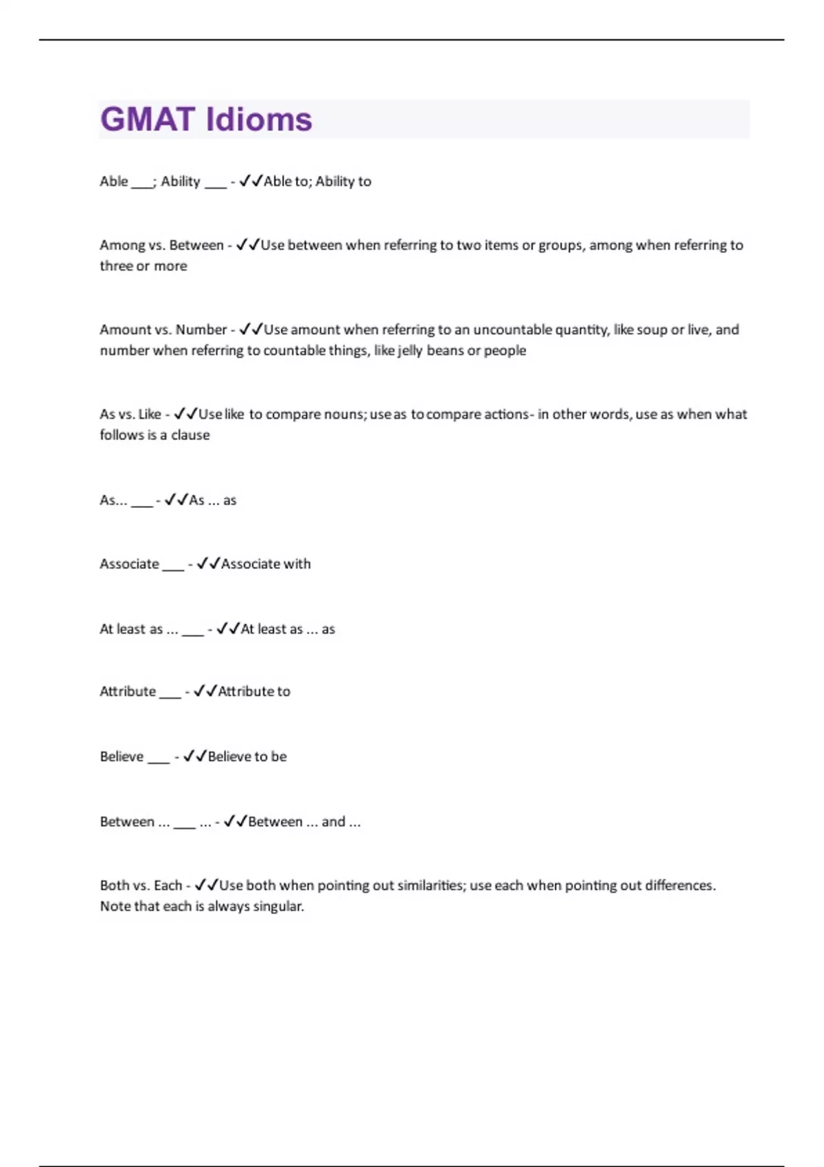 Able ___; Ability ___ - Able to; Ability to Among vs. Between - Use between when referring to two items or groups, among when referring to three or more Amount vs. Number - Use amount when referring to an uncountable quantity, like soup or live, and number when referring to countable things, like jelly beans or people As vs. Like - Use like to compare nouns; use as to compare actions- in other words, use as when what follows is a clause As... ___ - As ... as Associate ___ - Associate with At least as ... ___ - At least as ... as Attribute ___ - Attribute to Believe ___ - Believe to be Between ... ___ ... - Between ... and ... Both vs. Each - Use both when pointing out similarities; use each when pointing out differences. Note that each is always singular.