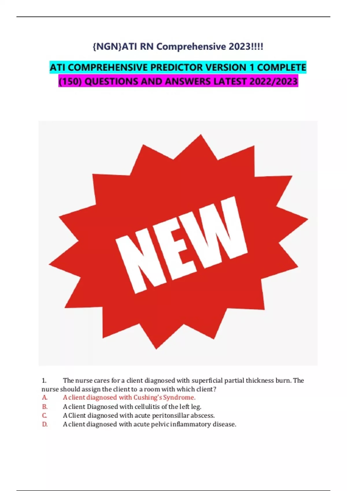 {NGN}ATI RN Comprehensive 2023!!!! ATI COMPREHENSIVE PREDICTOR VERSION 1 COMPLETE (150) QUESTIONS AND ANSWERS LATEST 2022/2023