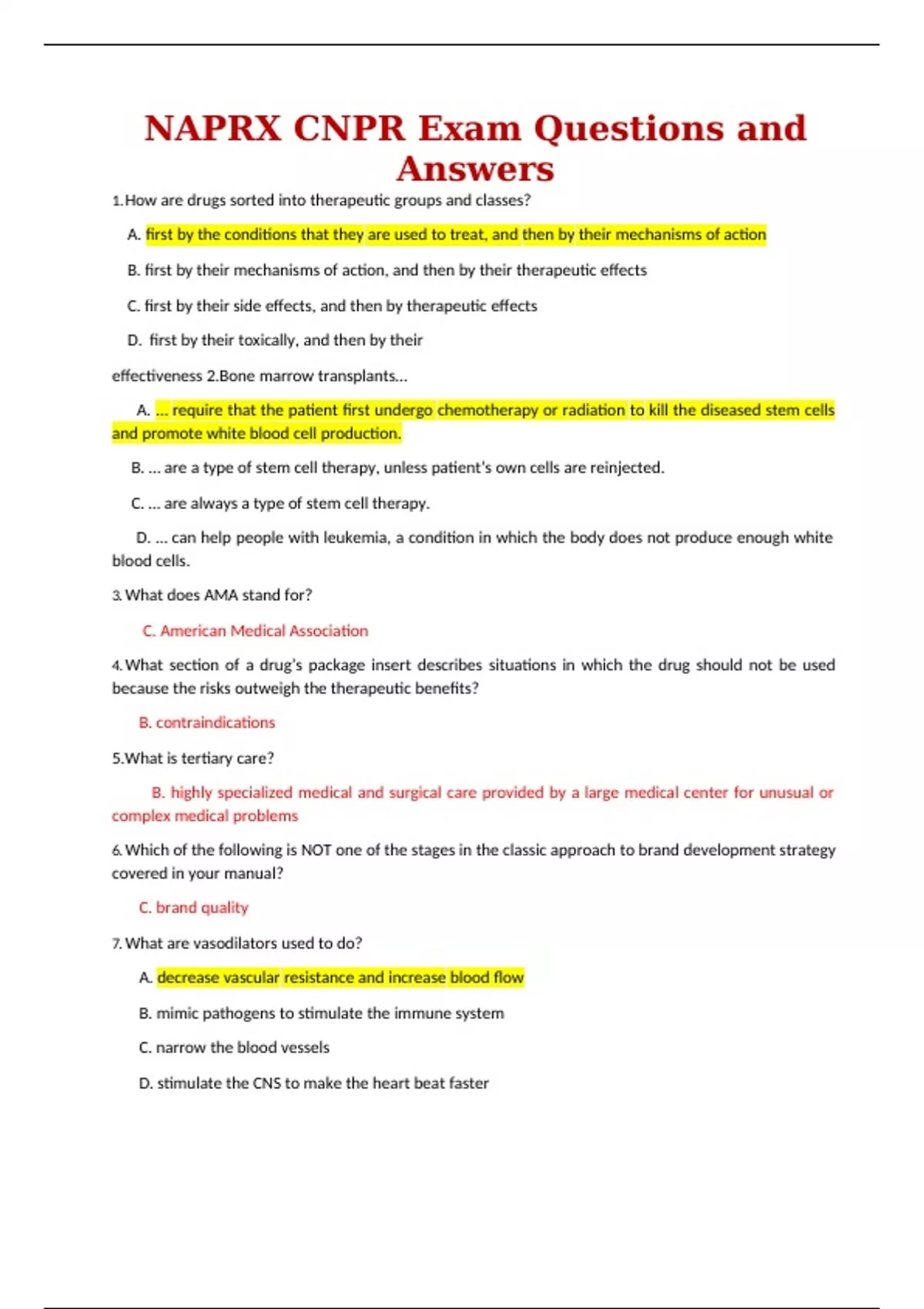 NAPRX CNPR Exam Questions and Answers 1. How are drugs sorted into therapeutic groups and classes? A. first by the conditions that they are used to treat, and then by their mechanisms of action B. first by their mechanisms of action, and then by their therapeutic effects C. first by their side effects, and then by therapeutic effects D. first by their toxically, and then by their effectiveness 2.Bone marrow transplants… A. … require that the patient first undergo chemotherapy or radiation to kill the diseased stem cells and promote white blood cell production. B. … are a type of stem cell therapy, unless patient’s own cells are reinjected. C. … are always a type of stem cell therapy. D. … can help people with leukemia, a condition in which the body does not produce enough white blood cells. 3. What does AMA stand for? C. American Medical Association 4. What section of a drug’s package insert describes situations in which the drug should not be used because the risks outweigh the therapeutic benefits? B. contraindications 5.What is tertiary care? B. highly specialized medical and surgical care provided by a large medical center for unusual or complex medical problems 6. Which of the following is NOT one of the stages in the classic approach to brand development strategy covered in your manual? C. brand quality 7. What are vasodilators used to do? A. decrease vascular resistance and increase blood flow B. mimic pathogens to stimulate the immune system C. narrow the blood vessels D. stimulate the CNS to make the heart beat faster