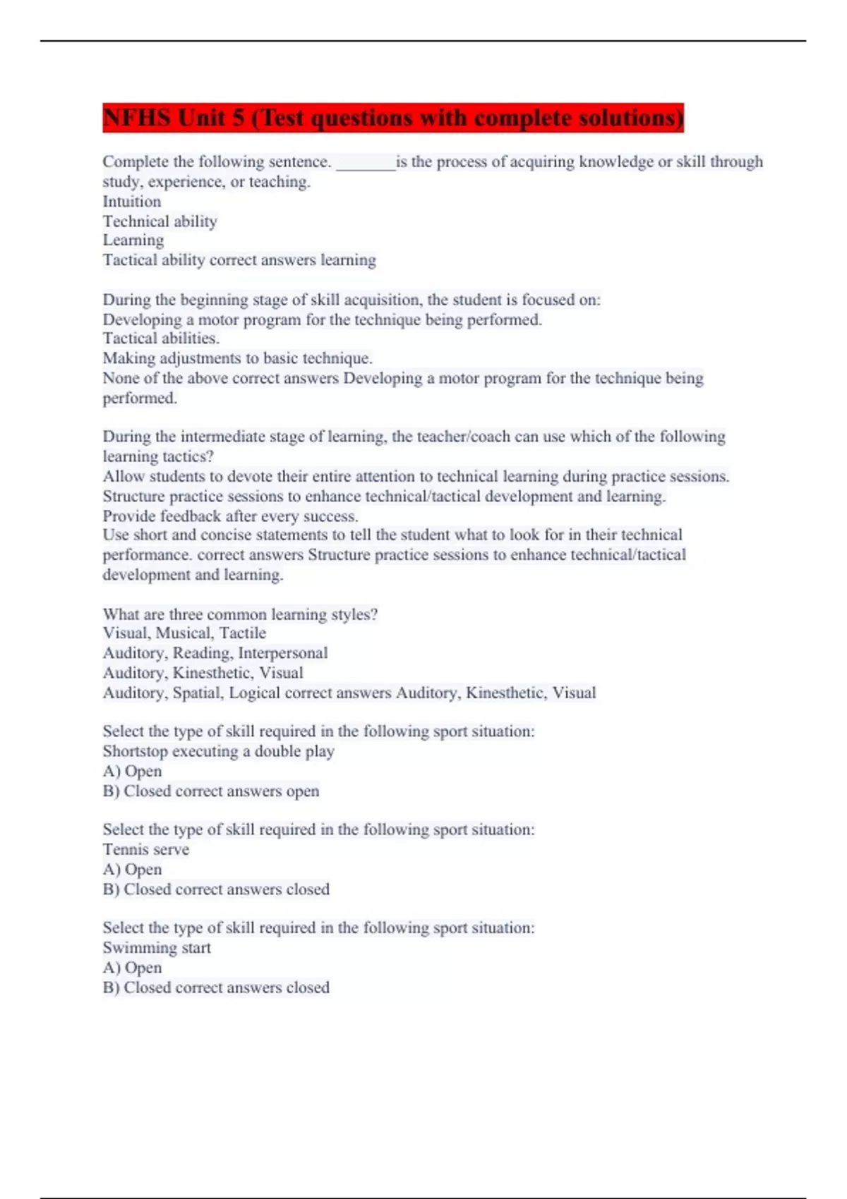 Complete the following sentence. _______is the process of acquiring knowledge or skill through study, experience, or teaching. Intuition Technical ability Learning Tactical ability correct answers learning During the beginning stage of skill acquisition, the student is focused on: Developing a motor program for the technique being performed. Tactical abilities. Making adjustments to basic technique. None of the above correct answers Developing a motor program for the technique being performed. During the intermediate stage of learning, the teacher/coach can use which of the following learning tactics? Allow students to devote their entire attention to technical learning during practice sessions. Structure practice sessions to enhance technical/tactical development and learning. Provide feedback after every success. Use short and concise statements to tell the student what to look for in their technical performance. correct answers Structure practice sessions to enhance technical/tactical development and learning. What are three common learning styles? Visual, Musical, Tactile Auditory, Reading, Interpersonal Auditory, Kinesthetic, Visual Auditory, Spatial, Logical correct answers Auditory, Kinesthetic, Visual Select the type of skill required in the following sport situation: Shortstop executing a double play A) Open B) Closed correct answers open Select the type of skill required in the following sport situation: Tennis serve A) Open B) Closed correct answers closed Select the type of skill required in the following sport situation: Swimming start A) Open B) Closed correct answers closed