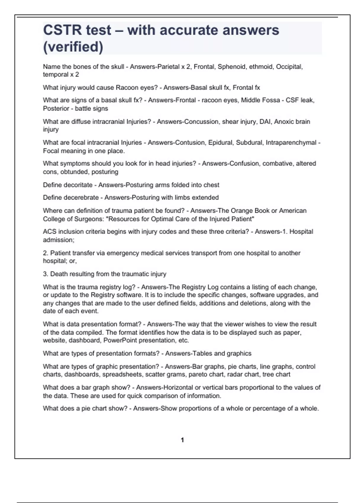 Name the bones of the skull - Answers-Parietal x 2, Frontal, Sphenoid, ethmoid, Occipital, temporal x 2 What injury would cause Racoon eyes? - Answers-Basal skull fx, Frontal fx What are signs of a basal skull fx? - Answers-Frontal - racoon eyes, Middle Fossa - CSF leak, Posterior - battle signs What are diffuse intracranial Injuries? - Answers-Concussion, shear injury, DAI, Anoxic brain injury What are focal intracranial Injuries - Answers-Contusion, Epidural, Subdural, Intraparenchymal - Focal meaning in one place. What symptoms should you look for in head injuries? - Answers-Confusion, combative, altered cons, obtunded, posturing Define decoritate - Answers-Posturing arms folded into chest Define decerebrate - Answers-Posturing with limbs extended Where can definition of trauma patient be found? - Answers-The Orange Book or American College of Surgeons: "Resources for Optimal Care of the Injured Patient" ACS inclusion criteria begins with injury codes and these three criteria? - Answers-1. Hospital admission; 2. Patient transfer via emergency medical services transport from one hospital to another hospital; or, 3. Death resulting from the traumatic injury What is the trauma registry log? - Answers-The Registry Log contains a listing of each change, or update to the Registry software. It is to include the specific changes, software upgrades, and any changes that are made to the user defined fields, additions and deletions, along with the date of each event. What is data presentation format? - Answers-The way that the viewer wishes to view the result of the data compiled. The format identifies how the data is to be displayed such as paper, website, dashboard, PowerPoint presentation, etc. What are types of presentation formats? - Answers-Tables and graphics What are types of graphic presentation? - Answers-Bar graphs, pie charts, line graphs, control charts, dashboards, spreadsheets, scatter grams, pareto chart, radar chart, tree chart What does a bar graph show? - Answers-Horizontal or vertical bars proportional to the values of the data. These are used for quick comparison of information. What does a pie chart show? - Answers-Show proportions of a whole or percentage of a whole.
