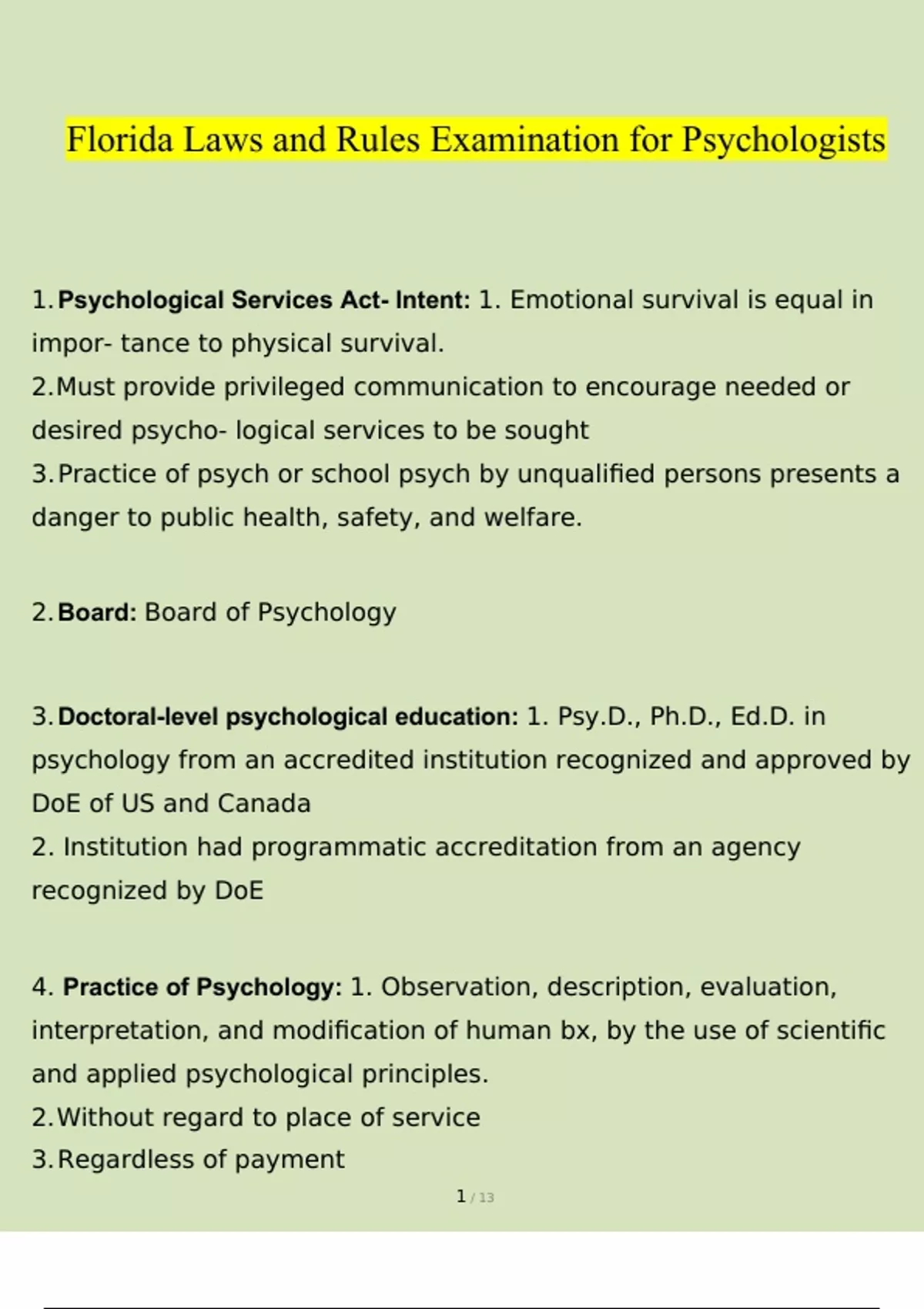 Florida Laws and Rules Examination for Psychologists (Verified) Florida Laws and Rules Examination for Psychologists (Verified)