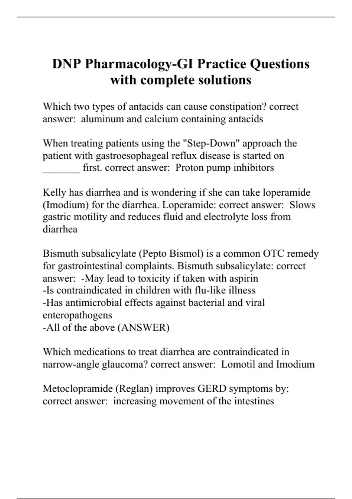 Which two types of antacids can cause constipation? correct answer: aluminum and calcium containing antacids When treating patients using the "Step-Down" approach the patient with gastroesophageal reflux disease is started on _______ first. correct answer: Proton pump inhibitors Kelly has diarrhea and is wondering if she can take loperamide (Imodium) for the diarrhea. Loperamide: correct answer: Slows gastric motility and reduces fluid and electrolyte loss from diarrhea Bismuth subsalicylate (Pepto Bismol) is a common OTC remedy for gastrointestinal complaints. Bismuth subsalicylate: correct answer: -May lead to toxicity if taken with aspirin -Is contraindicated in children with flu-like illness -Has antimicrobial effects against bacterial and viral enteropathogens -All of the above (ANSWER) Which medications to treat diarrhea are contraindicated in narrow-angle glaucoma? correct answer: Lomotil and Imodium Metoclopramide (Reglan) improves GERD symptoms by: correct answer: increasing movement of the intestines Calcium containing antacids are contraindicated in patients that have: correct answer: history of renal calculi Antacids treat gastroesophageal reflux disease by: correct