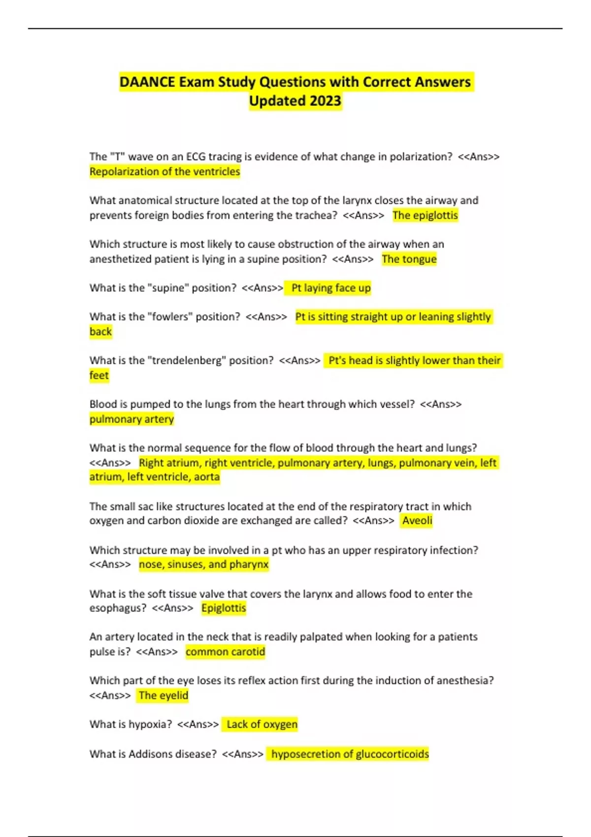 DAANCE Exam Study Questions with Correct Answers Updated 2023