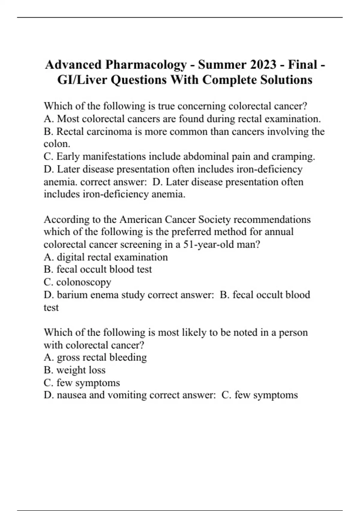 Which of the following is true concerning colorectal cancer? A. Most colorectal cancers are found during rectal examination. B. Rectal carcinoma is more common than cancers involving the colon. C. Early manifestations include abdominal pain and cramping. D. Later disease presentation often includes iron-deficiency anemia. correct answer: D. Later disease presentation often includes iron-deficiency anemia. According to the American Cancer Society recommendations which of the following is the preferred method for annual colorectal cancer screening in a 51-year-old man? A. digital rectal examination B. fecal occult blood test C. colonoscopy D. barium enema study correct answer: B. fecal occult blood test Which of the following is most likely to be noted in a person with colorectal cancer? A. gross rectal bleeding B. weight loss C. few symptoms D. nausea and vomiting correct answer: C. few symptoms Which of the following does not increase a patient's risk of developing colorectal cancer?
